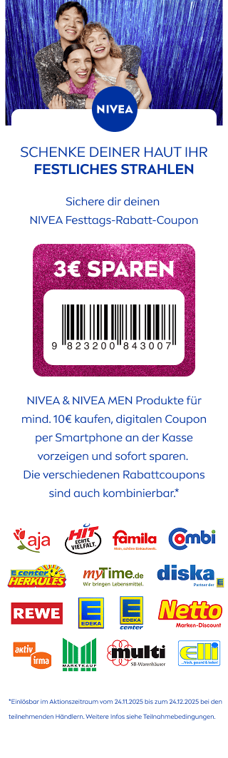 Bei einem Kauf von NIVEA & NIVEA MEN Produkten deiner Wahl mit einem Mindestgesamtpreis von 10€ (ausgenommen NIVEA CELLULAR Epigenetics Verjüngendes Serum) und Vorlage eines 3€-Coupons erhältst du einen Sofortrabatt in Höhe von 3€ direkt an der Kasse. Keine Barauszahlung möglich. Nicht mit anderen Promotion-Aktionen von Beiersdorf kombinierbar. Nur in teilnehmenden Märkten innerhalb Deutschlands. Coupon einlösbar im Aktionszeitraum vom 24.11. - 24.12.2025