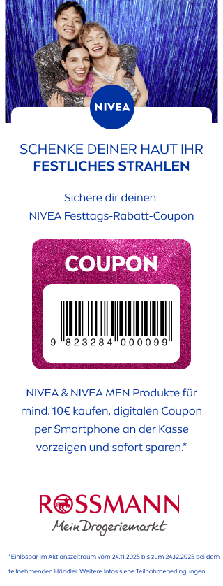 Bei einem Kauf von NIVEA & NIVEA MEN Produkten deiner Wahl mit einem Mindestgesamtpreis von 10€ (ausgenommen NIVEA CELLULAR Epigenetics Verjüngendes Serum) und Vorlage eines 3€-Coupons erhältst du einen Rabatt in Höhe von 3€ direkt an der Kasse. Der Mindestgesamtpreis für einen 5€-Coupon beträgt 15€ und der Mindestgesamtpreis für einen 7€-Coupon beträgt 20€. Die verschiedenen Rabattcoupons der Weihnachts-Aktion sind kombinierbar bei Erreichen des addierten Mindestgesamtpreises. Keine Barauszahlung möglich. Nicht mit anderen Promotion-Aktionen von Beiersdorf kombinierbar. Nur in teilnehmenden Märkten innerhalb Deutschlands. Coupons einlösbar im Aktionszeitraum vom 24.11. - 24.12.2025