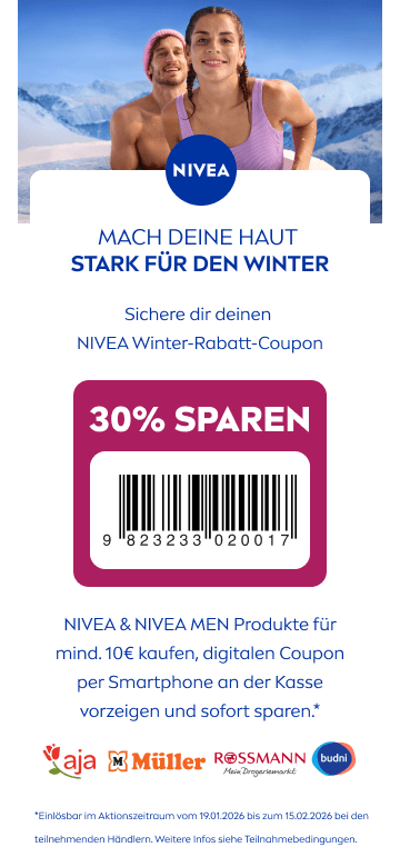 Beim Kauf von NIVEA/NIVEA MEN Produkten deiner Wahl mit einem Gesamteinkaufswert von mind. 10€ (ausgenommen Doppelpacks und Geschenksets) und bei gleichzeitiger Vorlage des NIVEA 30%-Rabatt Coupons erhältst du einen Sofort-Rabatt in Höhe von 30% auf die von dir gekauften NIVEA/NIVEA MEN Produkte direkt an der Kasse. Nur ein Coupon pro Kaufakt und nur Original-Coupons einlösbar. Keine Barauszahlung möglich. Nicht mit anderen Promotion-Aktionen der Beiersdorf AG kombinierbar. Nur in teilnehmenden Märkten innerhalb Deutschlands. Aktionszeitraum: 19.01. – 15.02.2026.