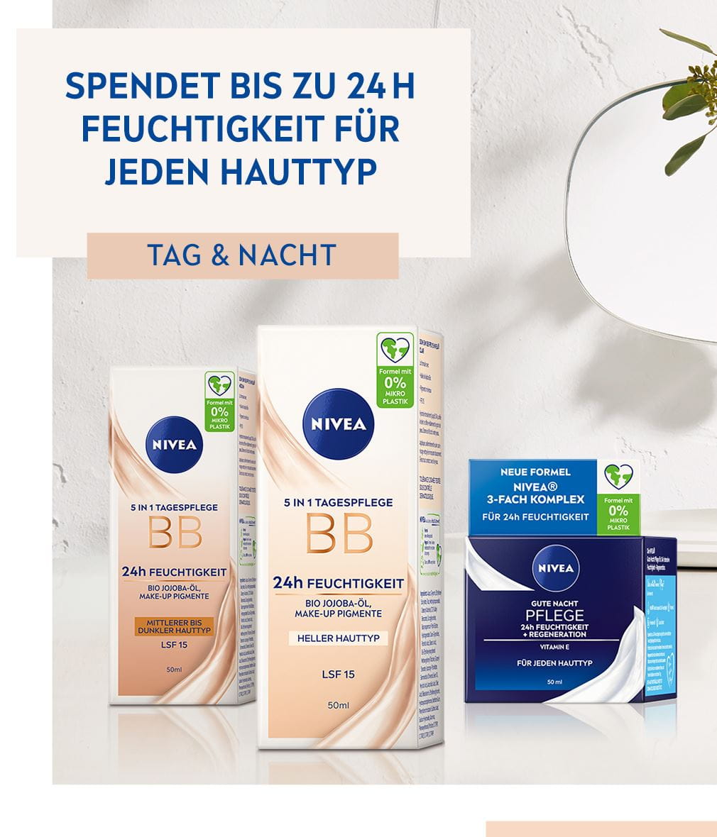 Die NIVEA 5in1 Tagespflege BB 24h Feuchtigkeit Mittel bis Dunkel ist ideal für mittlere bis dunkle Hauttypen geeignet. Sie deckt kleine Schönheitsmakel, wie Anzeichen von Müdigkeit, rötliche Partien und kleine Fältchen ab und schützt die Haut vor lichtbedingter Hautalterung mit LSF 15.