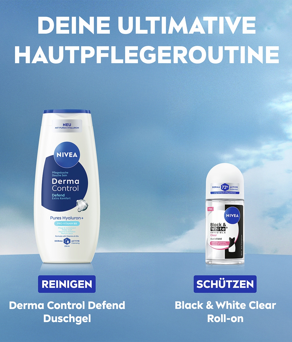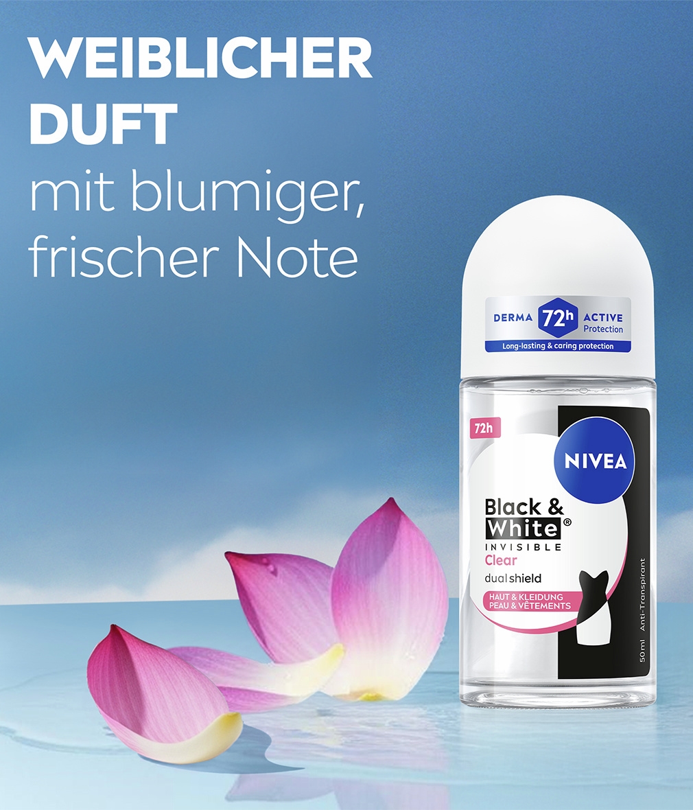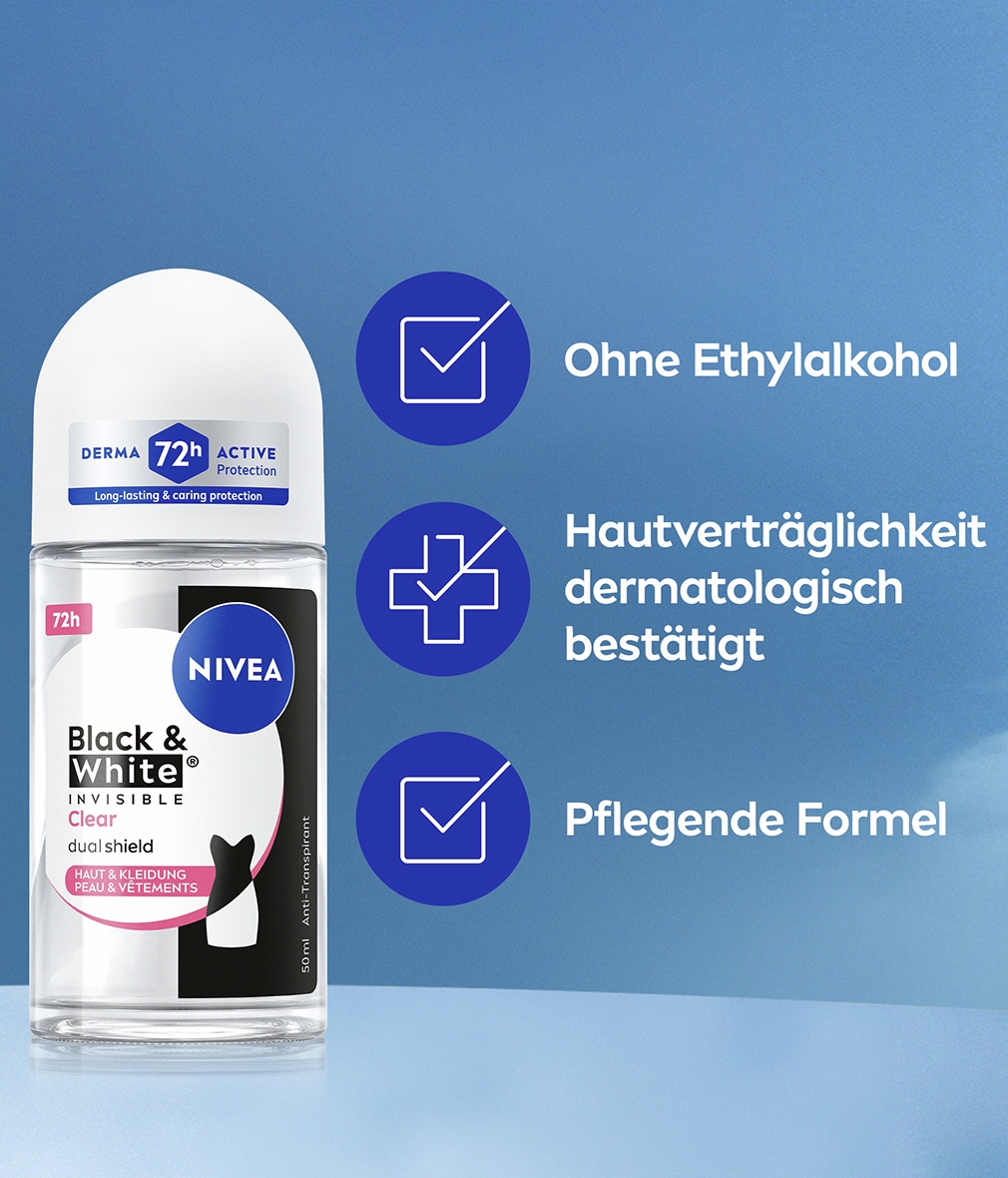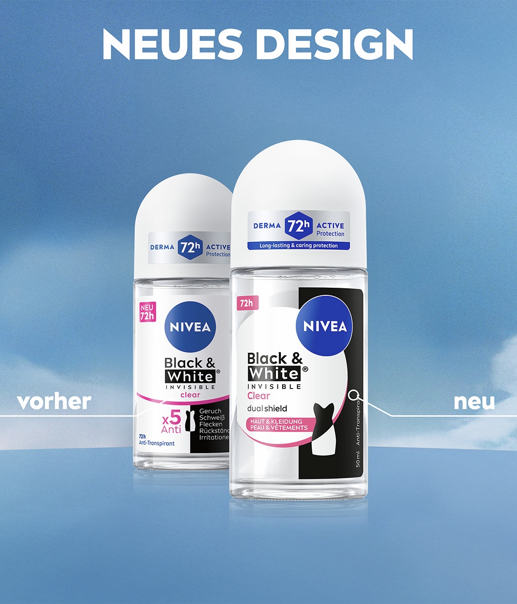 Die NIVEA Black & White Invisible mit Dual-Shield-Technologie schützt schwarze Kleidung vor weißen Flecken und weiße Kleidung vor gelben Flecken. Zuverlässiges 72-Stunden- Anti-Transpirant gegen Schweiß und Geruch, das Ihre Haut und Ihre Kleidung schützt.