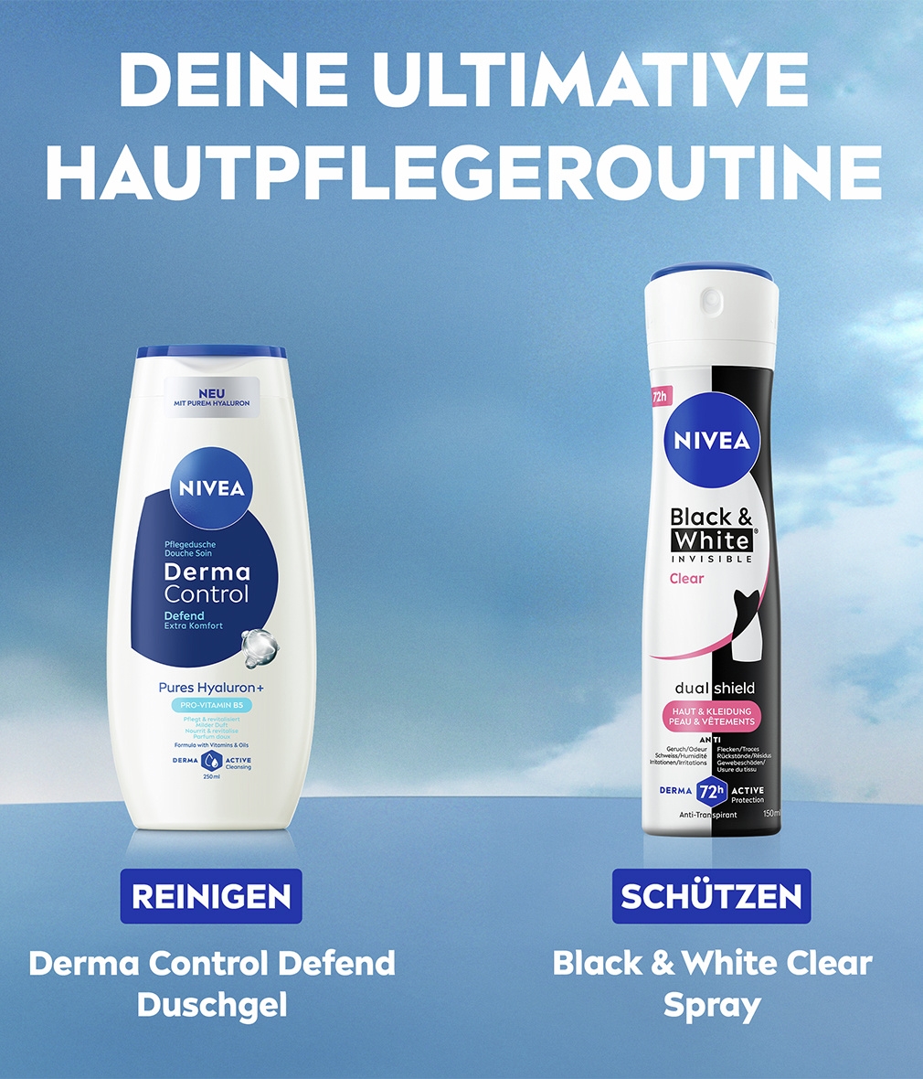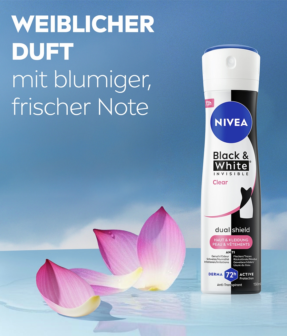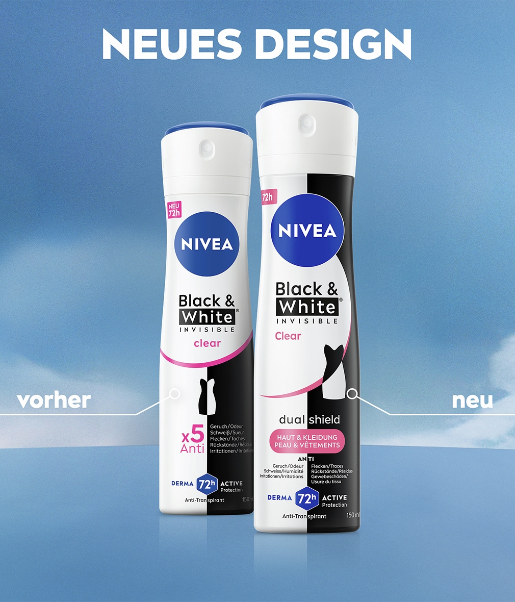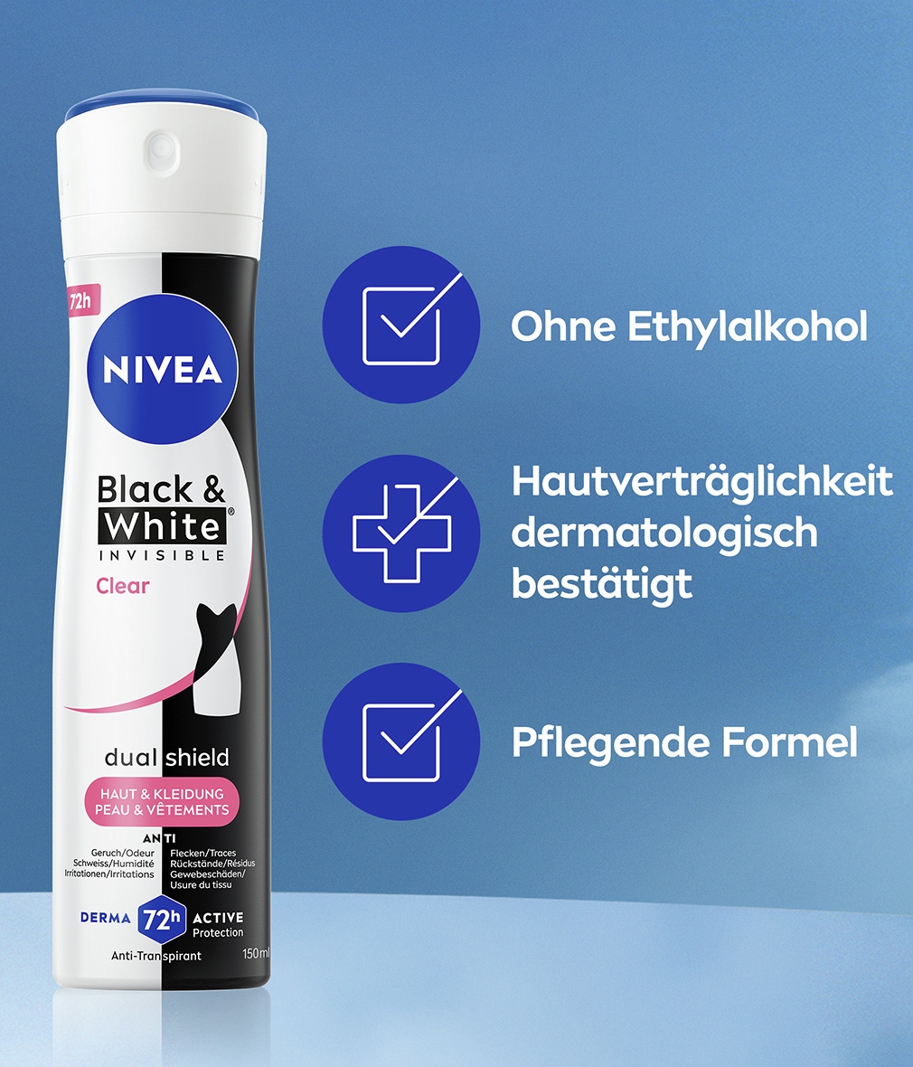 NIVEA Black & White Invisible mit Dual-Shield-Technologie schützt vor weißen Flecken auf schwarzer Kleidung und vor gelben Flecken auf weißer Kleidung. Zuverlässiges 72-Stunden-Antitranspirant gegen Schweiss und Geruch, das Ihre Haut und Ihre Kleidung schützt.