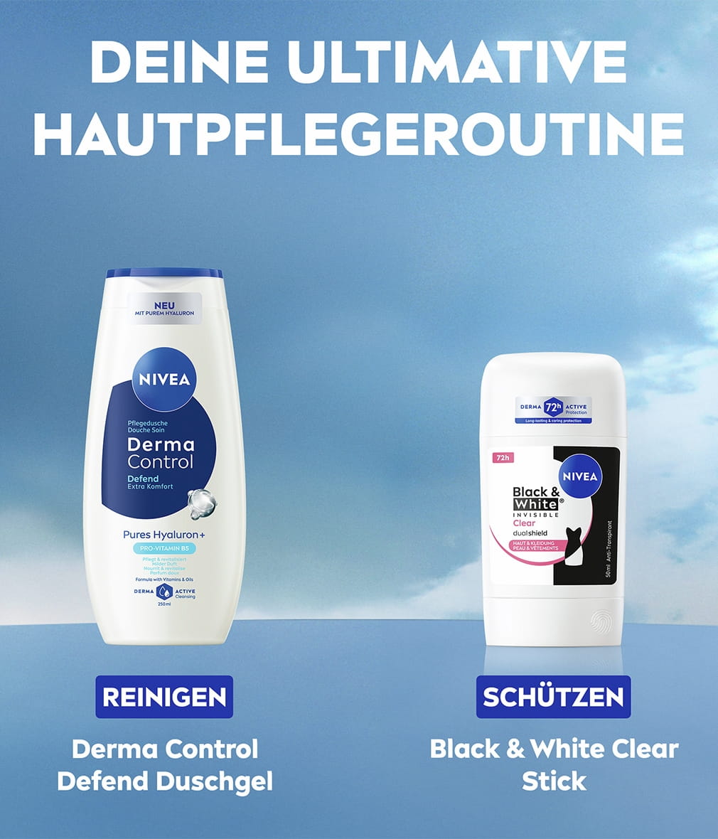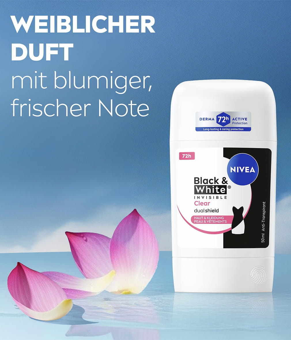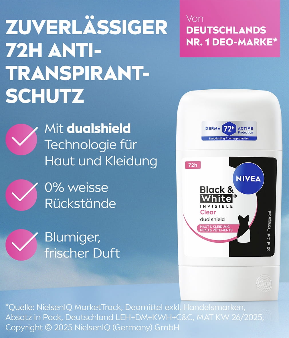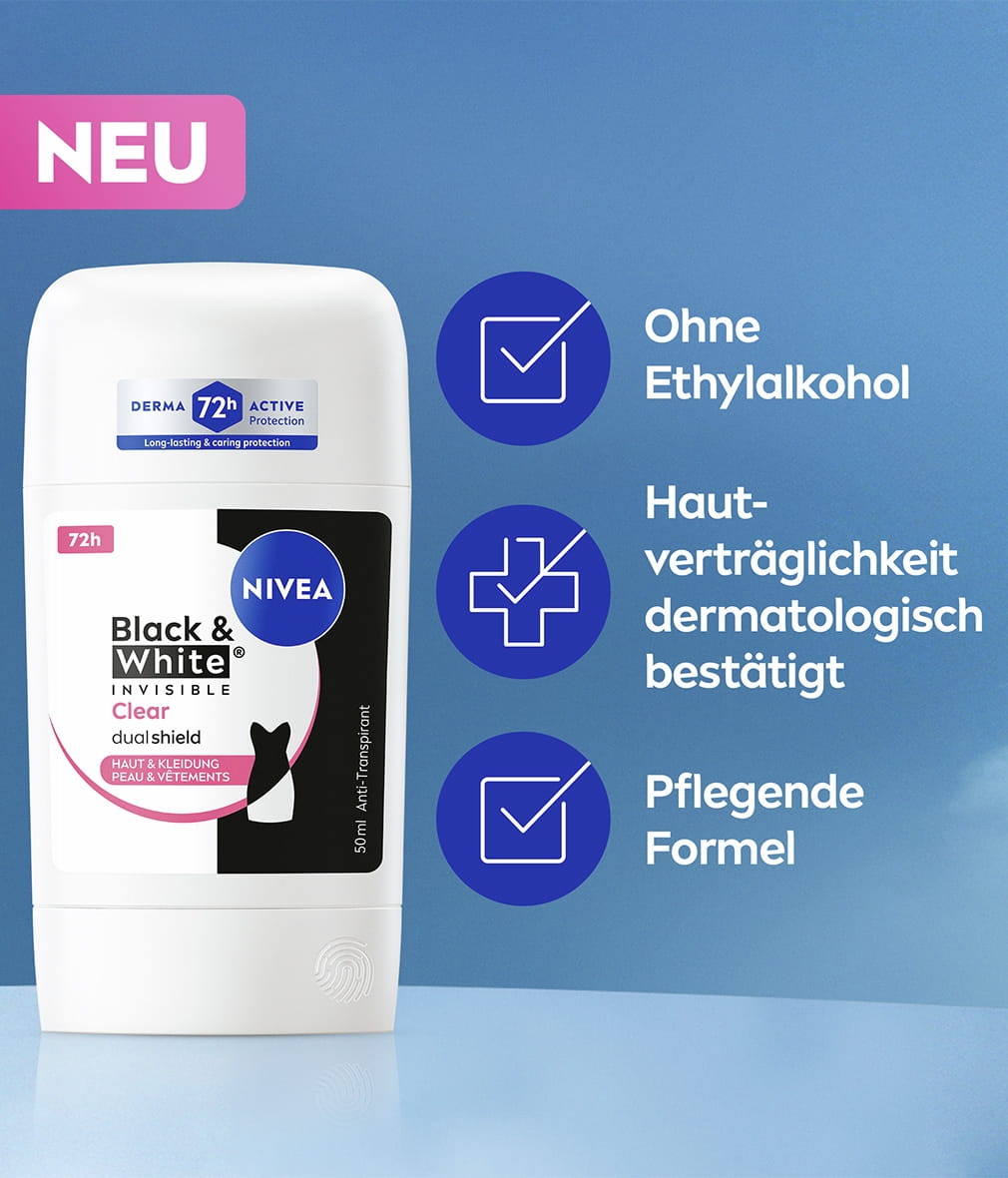 NIVEA Black & White Invisible mit Dual-Shield-Technologie schützt schwarze Kleidung vor weißen Flecken und weiße Kleidung vor gelben Flecken. Zuverlässiges 72-Stunden- Anti-Transpirant gegen Schweiß und Geruch, das Ihre Haut und Ihre Kleidung schützt.
