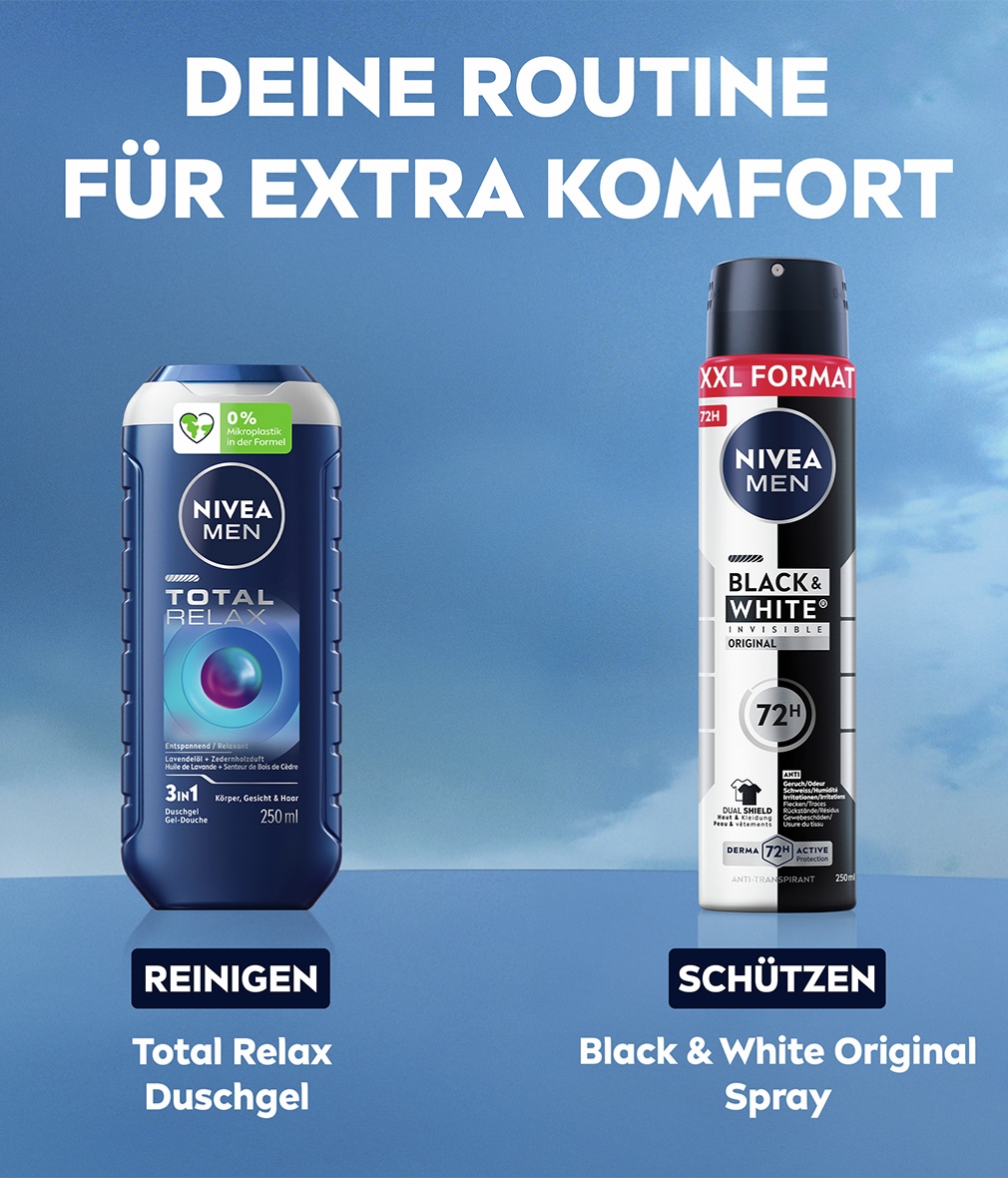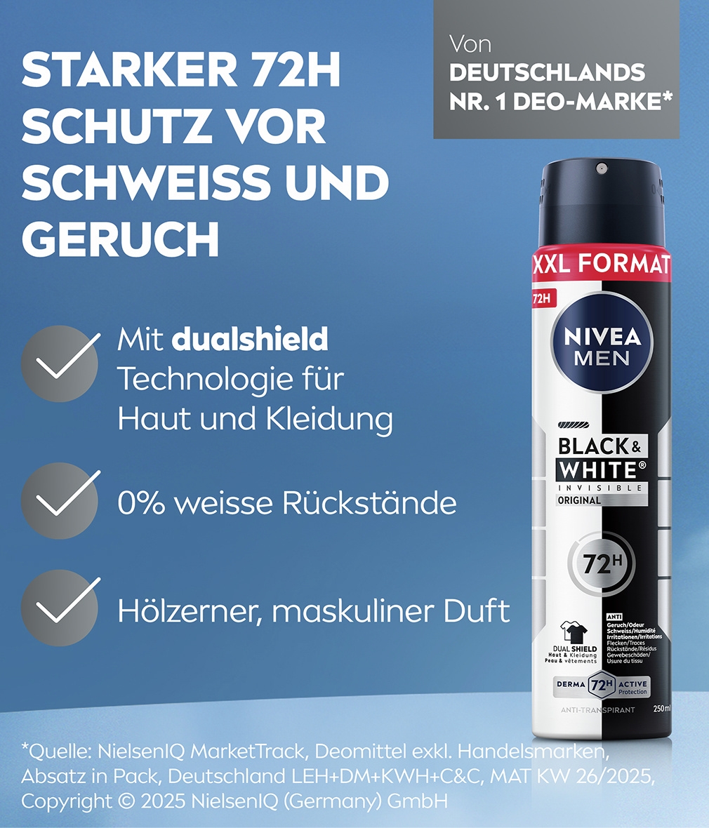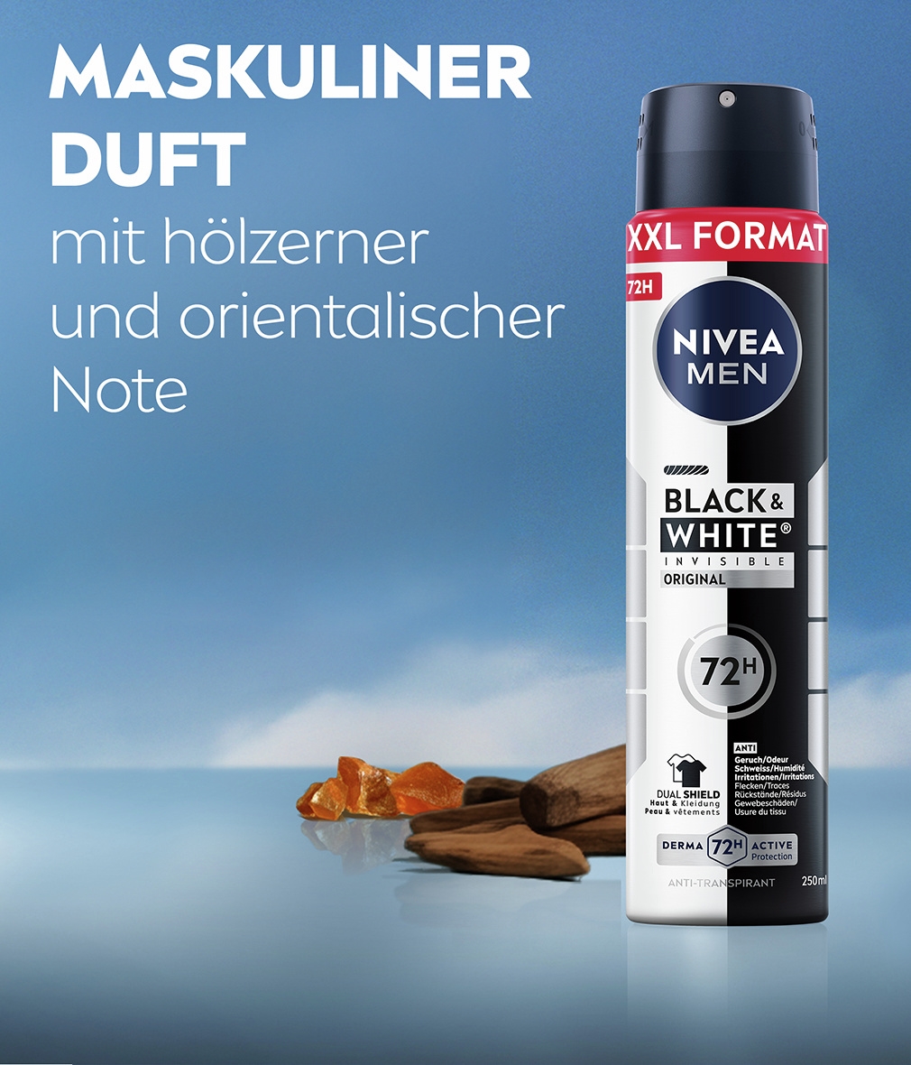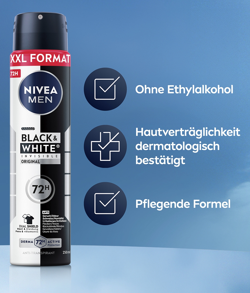 Die NIVEA MEN Black & White Invisible mit Dual-Shield-Technologie schützt schwarze Kleidung vor weißen Flecken und weiße Kleidung vor gelben Flecken. Zuverlässiges 72-Stunden- Anti-Transpirant gegen Schweiß und Geruch, das Ihre Haut und Ihre Kleidung schützt.