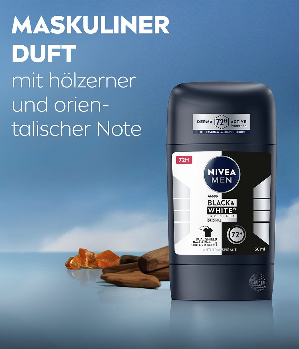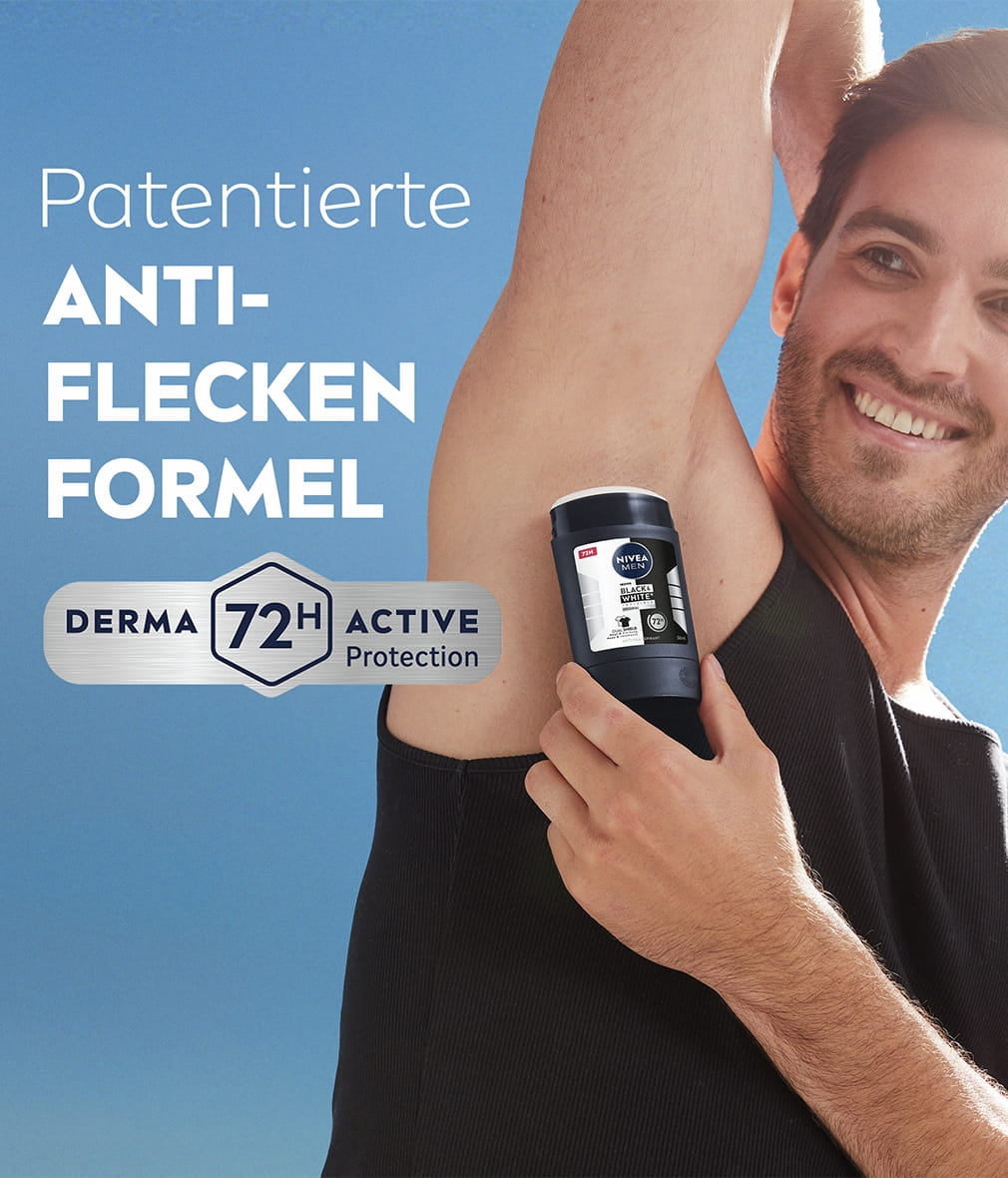 Die NIVEA MEN Black & White Invisible mit Dual-Shield-Technologie schützt schwarze Kleidung vor weißen Flecken und weiße Kleidung vor gelben Flecken. Zuverlässiges 72-Stunden- Anti-Transpirant gegen Schweiß und Geruch, das Ihre Haut und Ihre Kleidung schützt.
