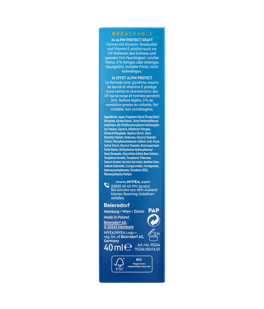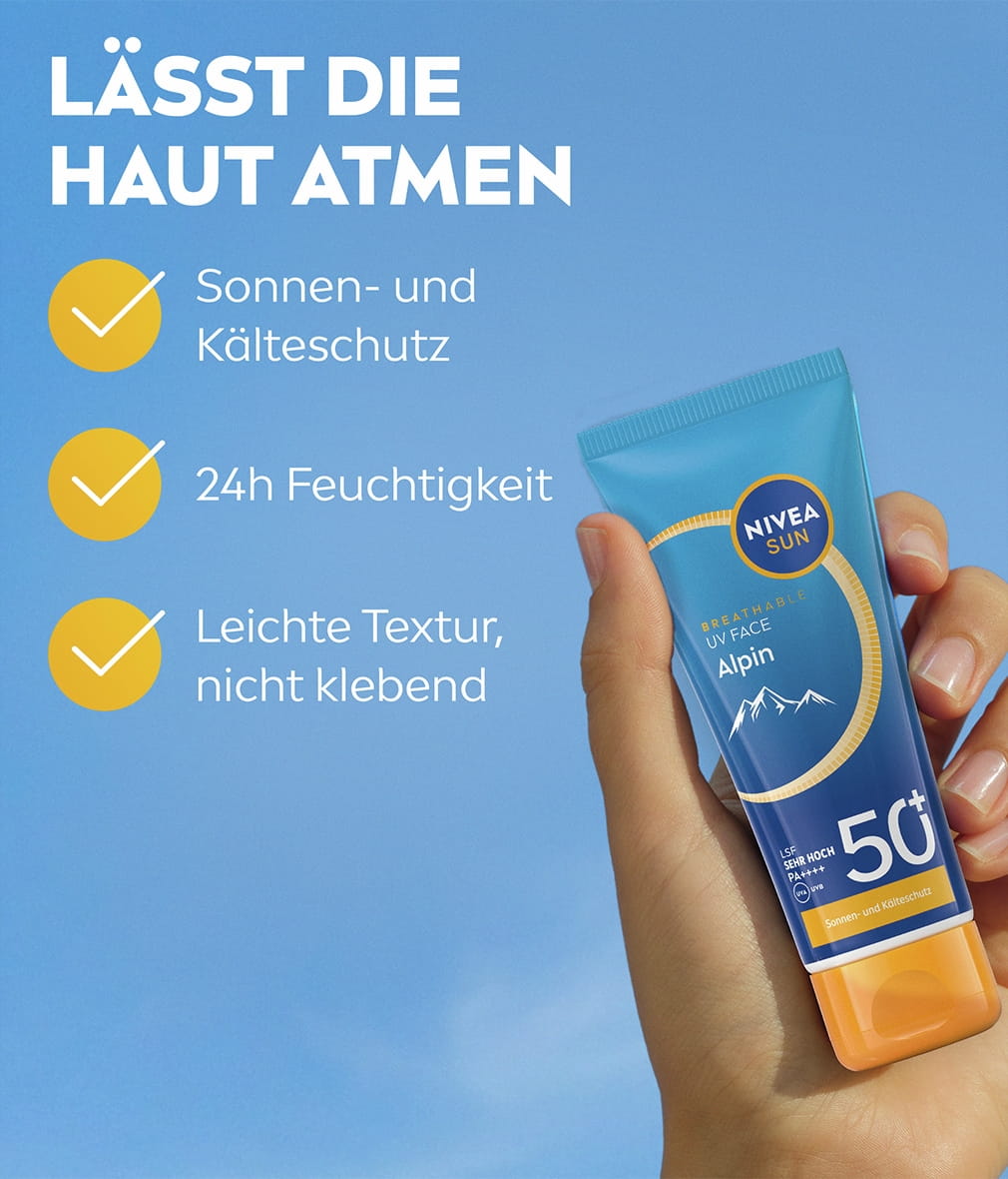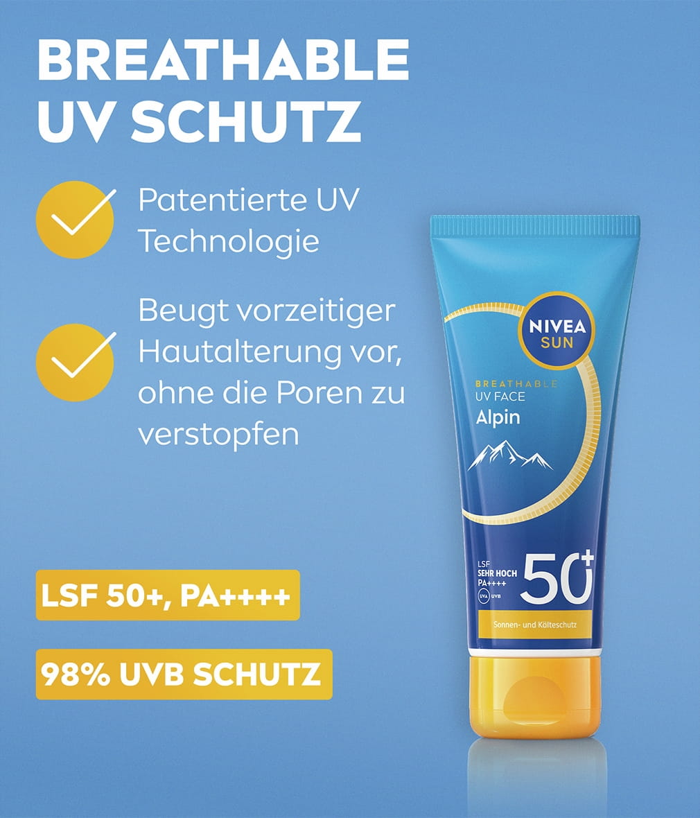 NIVEA SUN Breathable UV Gesicht Alpin LSF 50+ beugt vorzeitiger Hautalterung vor, ohne die Poren zu verstopfen. Schützt bei Kälte und winterlichen Bedingungen. Spendet 24 Stunden lang Feuchtigkeit.
