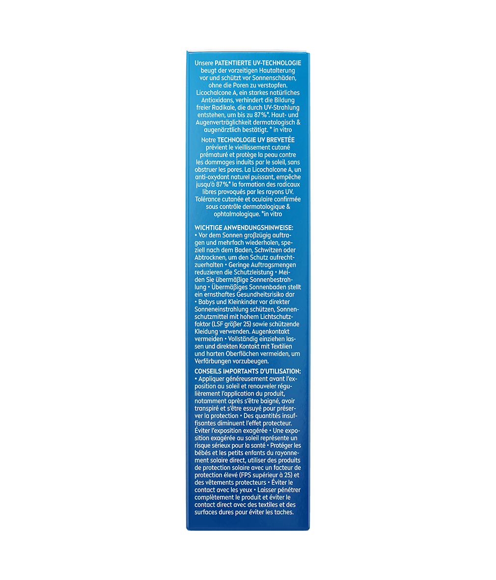 Wichtige Anwendungshinweise: Vor dem Sonnen großzügig auftragen und mehrfach wiederholen, speziell nach dem Baden, Schwitzen oder Abtrocknen, um den Schutz aufrechtzuerhalten. Geringe Auftragsmengen reduzieren die Schutzleistung. Meiden Sie übermäßige Sonnenbestrahlung. Übermäßiges Sonnenbaden stellt ein ernsthaftes Gesundheitsrisiko dar. Babys und Kleinkinder vor direkter Sonneneinstrahlung schützen, Sonnenschutzmittel mit hohem Lichtschutzfaktor (LSF größer 25) sowie schützende Kleidung verwenden. Augenkontakt vermeiden. Vollständig einziehen lassen und direkten Kontakt mit Textilien und harten Oberflächen vermeiden, um Verfärbungen vorzubeugen.