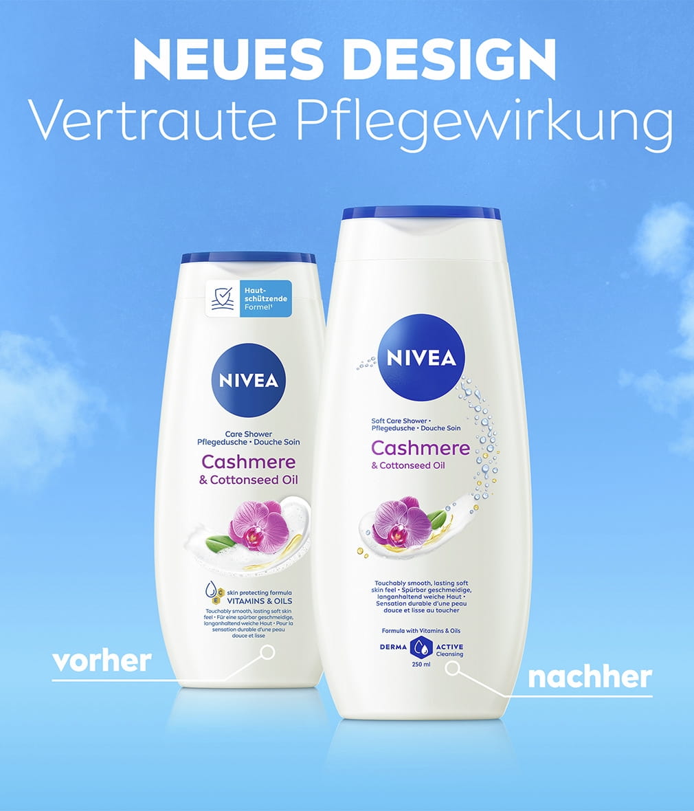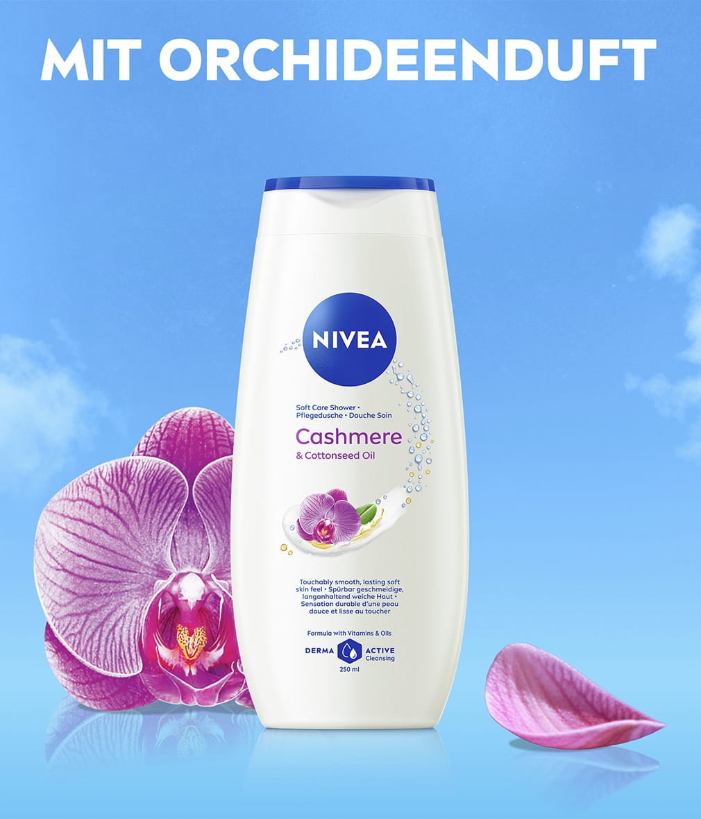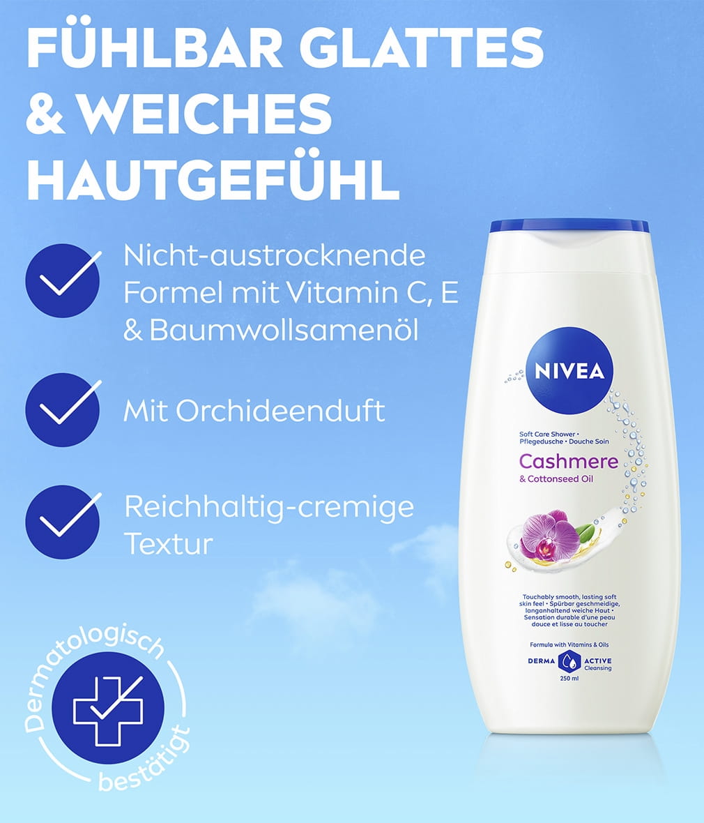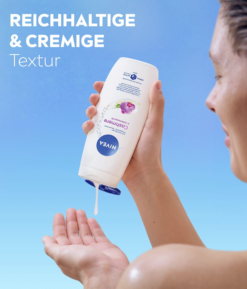 Pflegendes Duschgel mit Baumwollsamenöl für ein spürbar glattes und langanhaltend weiches Hautgefühl. Mit Vitamin C & E und wertvollen Ölen formuliert, um die Haut vor dem Austrocknen zu schützen: NIVEA Cashmere & Cottonseed Oil Pflegedusche.