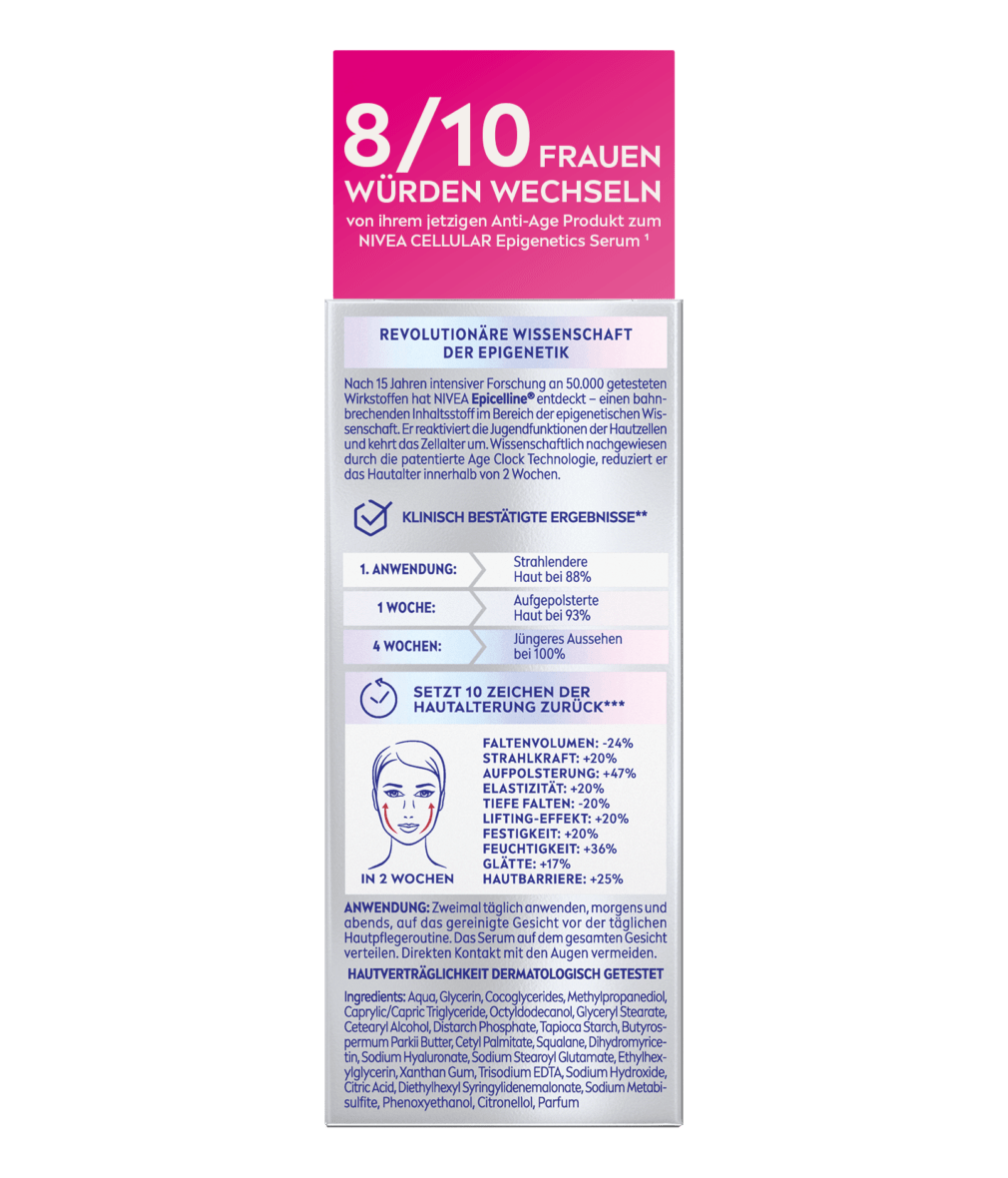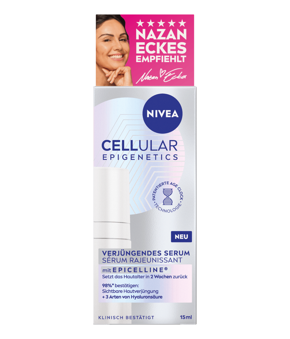 Das Cellular Epigenetics Verjüngendes Serum ist ein effektives Serum, das für ein strahlenderes, aufgepolsterteres und jugendlicheres Aussehen sorgt. Nach 15 Jahren intensiver Forschung an 50.000 getesteten Wirkstoffen hat NIVEA Epicelline® entdeckt - einen bahnbrechenden Inhaltsstoff im Bereich der epigenetischen Wissenschaft, der die Jugendfunktionen der Hautzellen reaktiviert und das Zellalter umkehrt. Wissenschaftlich nachgewiesen durch die patentierte Age Clock Technologie, reduziert er das Hautalter innerhalb von 2 Wochen. Zusammen mit drei Arten von Hyaluronsäure ist das Serum die neueste Innovation von NIVEA im Anti-Ageing Bereich. Mit seiner effektiven Formel setzt es 10 Zeichen der Hautalterung** zurück und ist für alle Hauttypen geeignet.