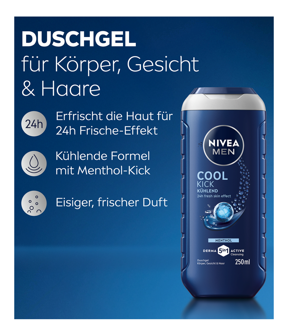 Fühlst du die Wärme? Dann erlebe die erfrischende Wirkung des NIVEA MEN Cool Kick Duschgels. Diese Formel sorgt für ein sofortiges Frischegefühl und belebt Körper, Gesicht und Haare gleichermaßen. Der kühlende Menthol-Kick erfrischt deine Sinne und macht jede Dusche zu einem belebenden Erlebnis. Gleichzeitig reinigt das Duschgel gründlich, ohne die Haut auszutrocknen, und hinterlässt ein gepflegtes Hautgefühl. Der markante Duft unterstreicht das Gefühl von Frische und Energie. Perfekt für Männer, die Wert auf Pflege und Erfrischung legen – besonders an heißen Tagen oder nach dem Sport. So startest du voller Energie in den Tag. NIVEA ist in über 160 Ländern vertreten und mit mehr als 140 Jahren Erfahrung eine der weltweit größten und vertrauenswürdigsten Hautpflegemarken. Als Marktführer in der globalen Hautpflegeindustrie arbeiten unsere Forscher intensiv daran, hochwertige, dermatologisch getestete Produkte für verschiedene Hauttypen und -bedürfnisse anzubieten.