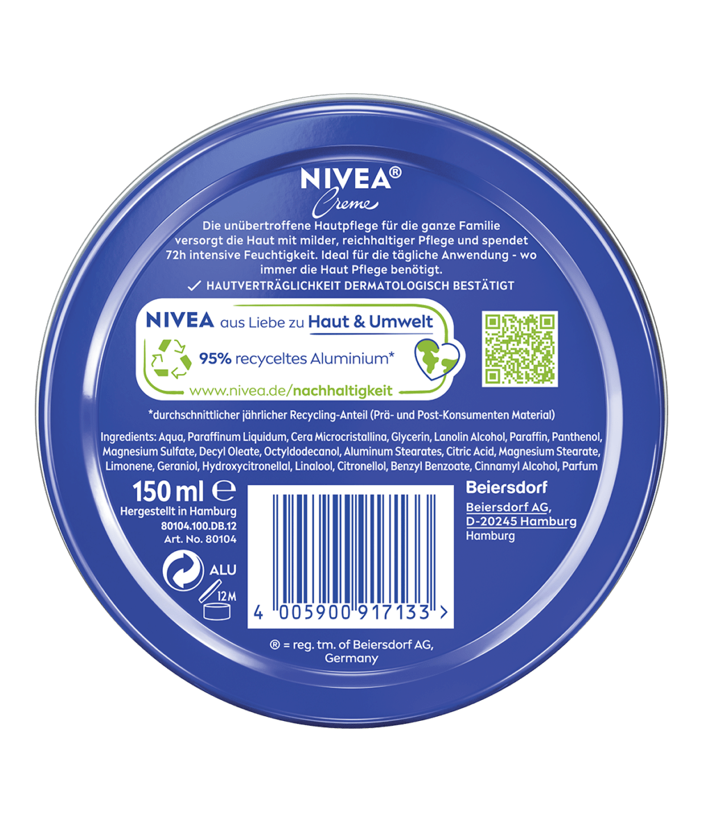 Vertrauen Sie der blauen Dose für die ganze Familie. Seit über 100 Jahren pflegt und schützt die NIVEA Creme mit ihrer reichhaltigen Formel jeden Hauttypen, in jedem Alter und bei jeder Gelegenheit. Für Gesicht, Körper und Hände spendet die Hautcreme, angereichert mit hautverwandtem Eucerit®, 72h lang effektiv Feuchtigkeit. Die cremige Textur mit dem beliebten Duft in der typischen Dose schützt und verwöhnt die Haut. Für die tägliche Anwendung geeignet - wo immer Ihre Haut milde und reichhaltige Pflege braucht. Die Creme stärkt die natürliche Hautbarriere, macht die Haut weich und geschmeidig und sorgt so für einen Effekt, den Sie fühlen und sehen können. Die Hautverträglichkeit ist dermatologisch bestätigt. NIVEA aus Liebe zu Haut & Umwelt: Die Creme Dose besteht nun aus 95% recyceltem Aluminium*. * durchschnittlicher jährlicher Recyclinganteil (Prä- und Post-Konsumenten Material)