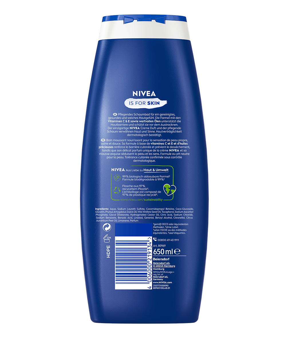 - Formel mit Vitamin C, E und wertvollen Ölen, die die Hautbarriere unterstützt und vor dem Austrocknen schützt, während der einzigartige NIVEA Creme-Duft und der verwöhnende Schaum Haut und Sinne gleichermaßen begeistern.