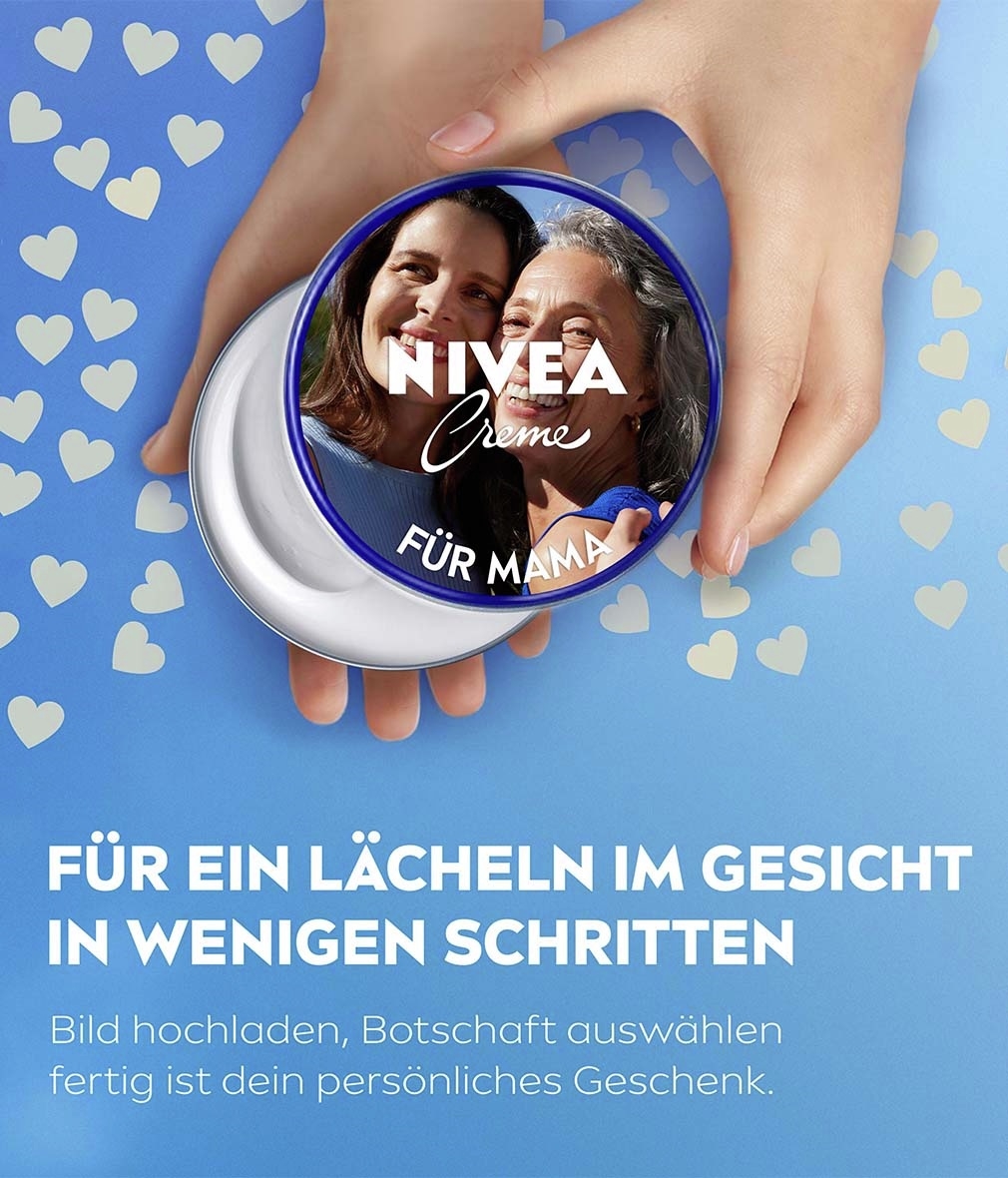 Gestalte die ikonische NIVEA Creme zu einem einzigartigen, personalisierten Geschenk. Einfach Bild hochladen, Botschaft auswählen und fertig ist dein individuelles Highlight für jeden Anlass. Jetzt wieder online gestaltbar auf: www.meine-nivea-fotodose.de