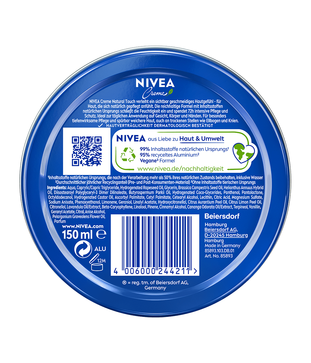 NIVEA Creme Natural Touch ist die erste Erweiterung der NIVEA Creme Produktlinie, einer der Ikonen von NIVEA, der weltweit führenden Hautpflegemarke⁶. NIVEA Creme und NIVEA Creme Natural Touch werden mit Sorgfalt hergestellt und sind auf die Bedürfnisse deiner Haut abgestimmt, wobei sie gleichzeitig die hohen Qualitätsstandards erfüllen, um deinen Erwartungen gerecht zu werden.
