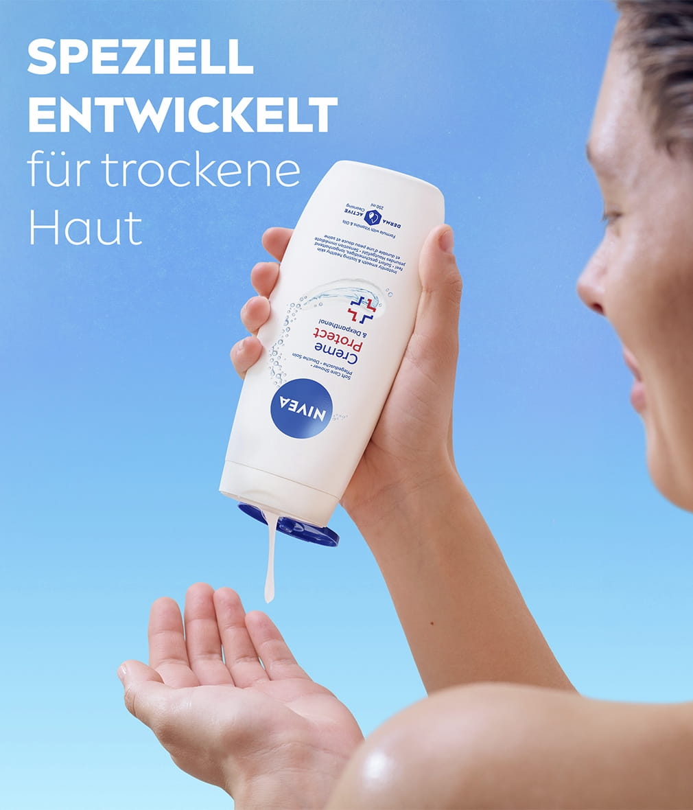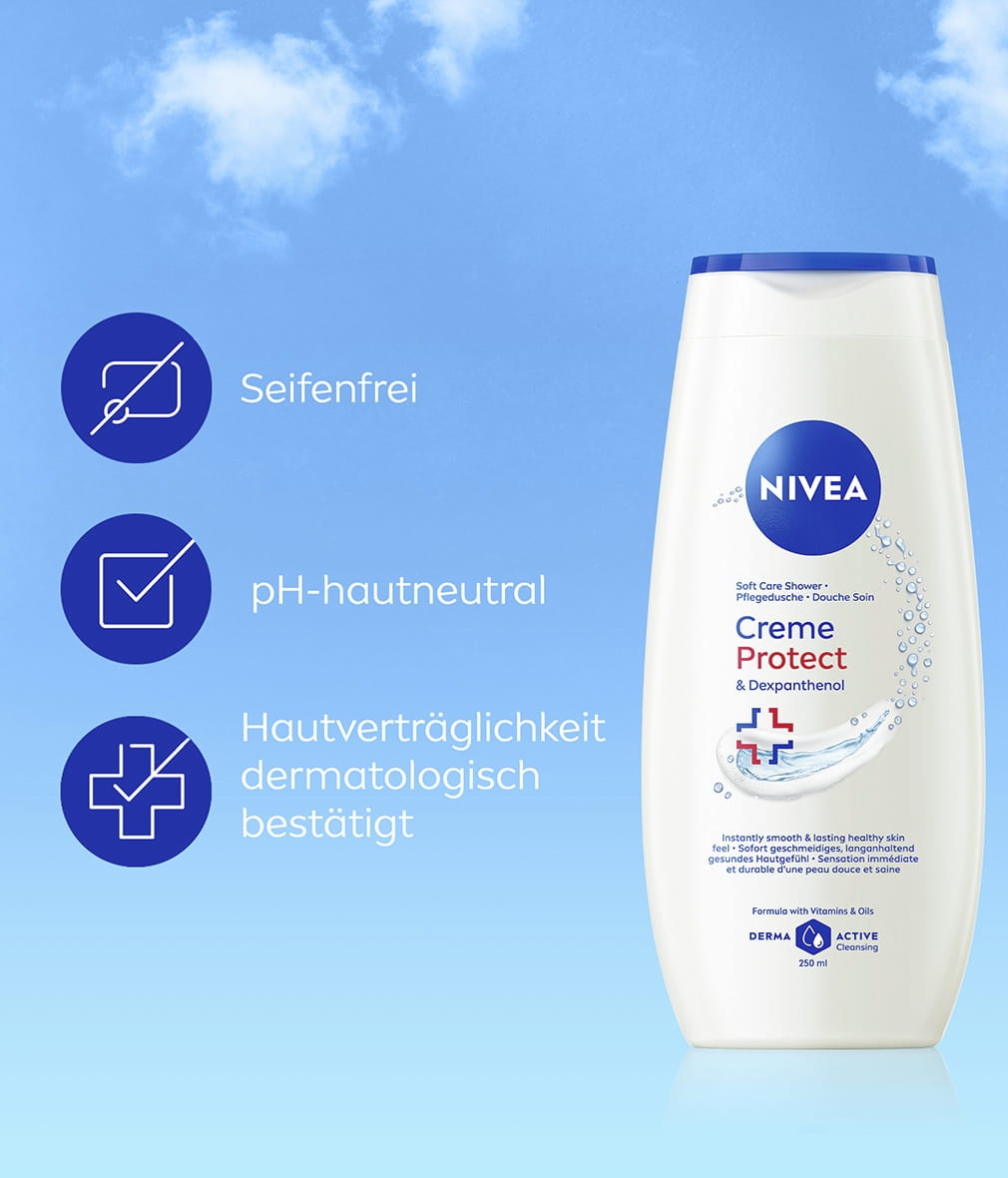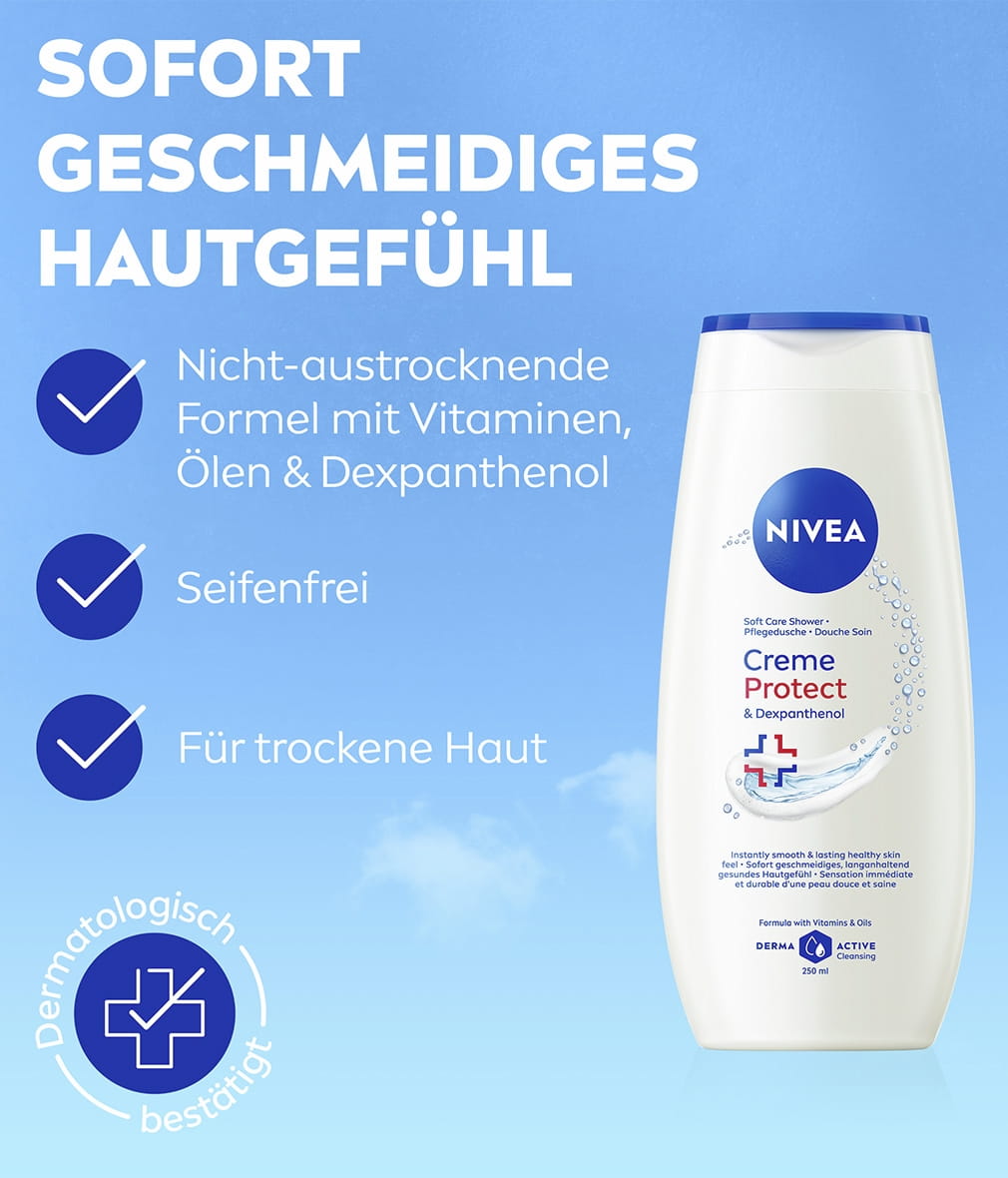 NIVEA Creme Protect & Dexpanthenol Pflegedusche pflegt und schützt die Haut sofort und sorgt für ein langanhaltend gesundes Hautgefühl. Mit natürlichen Inhaltsstoffen für eine sanfte Reinigung.