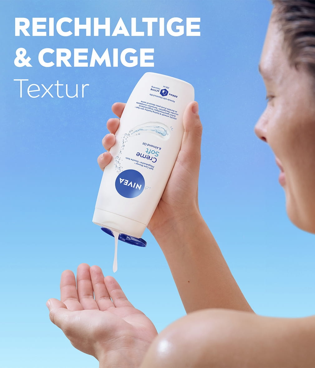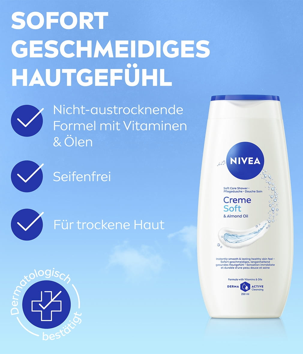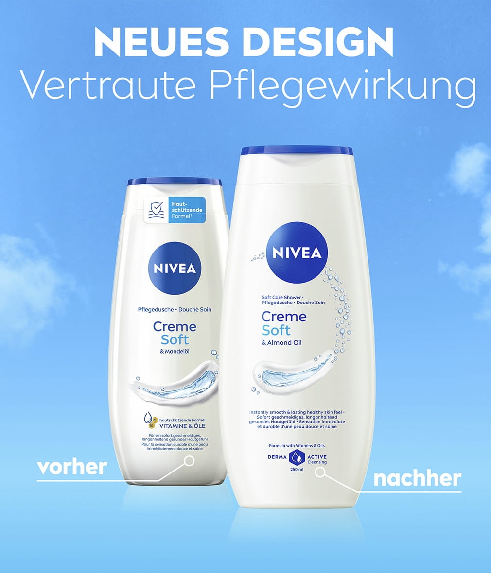 Pflegendes Duschgel, das Ihrer Haut ein weiches und gesundes Gefühl verleiht. Angereichert mit Vitamin C und E, wertvollen Ölen und Mandelöl reinigt dieses Duschgel die Haut sanft und schützt sie: NIVEA Creme Soft & Almond Oil Pflegedusche.