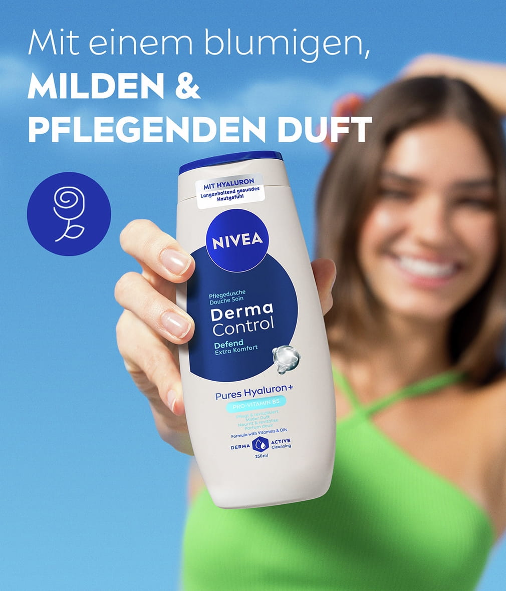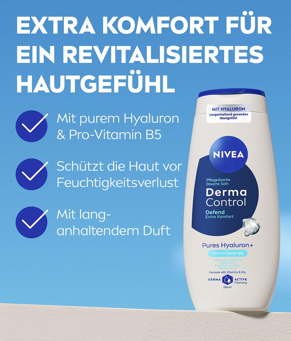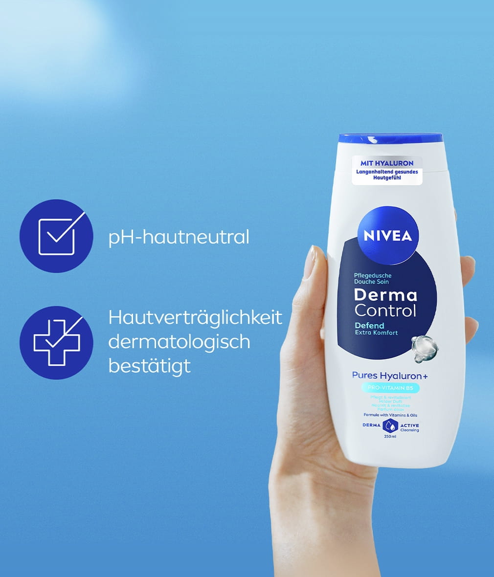 NIVEA Derma Control Defend Pflegedusche mit reinem Hyaluron und Pro-Vitamin B5 revitalisiert Ihre Haut und sorgt für zusätzlichen Komfort. Die Formel reinigt die Haut sanft und stärkt gleichzeitig ihre Widerstandsfähigkeit gegen Irritationen und Austrocknung. Für ein gesundes Hautgefühl.