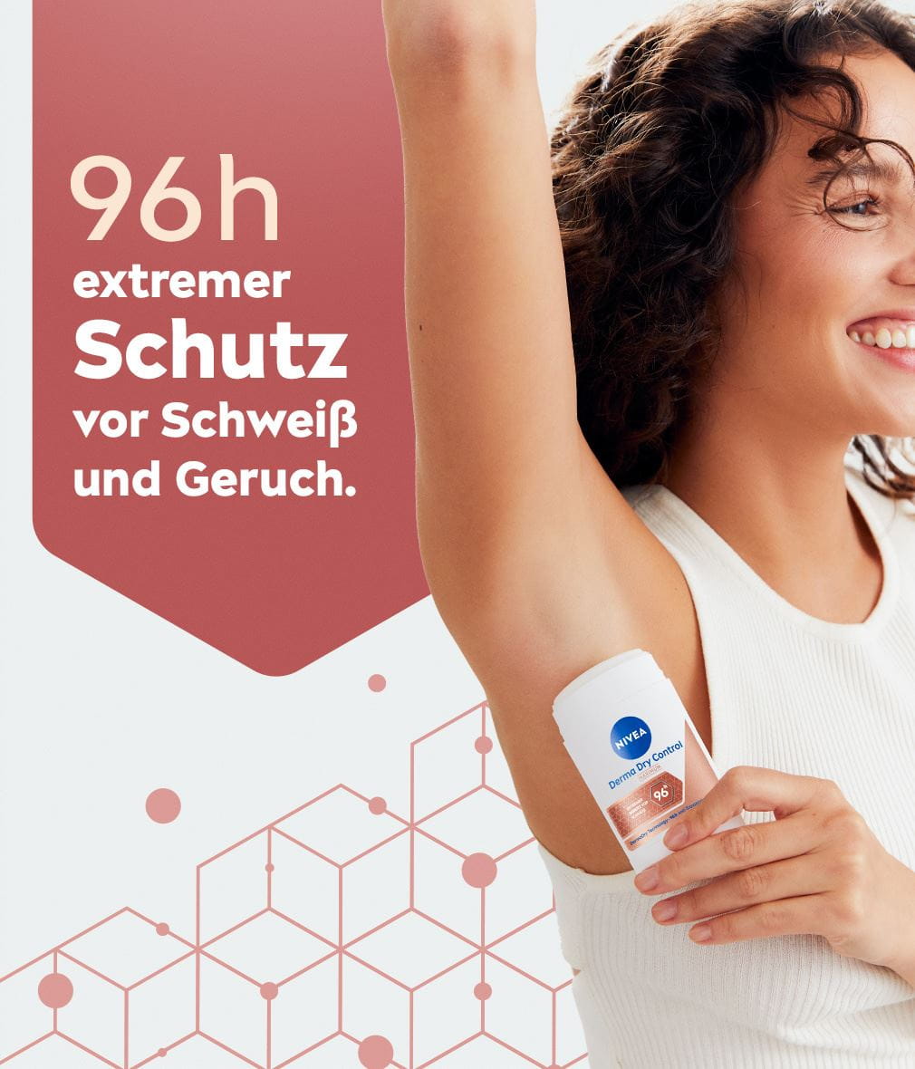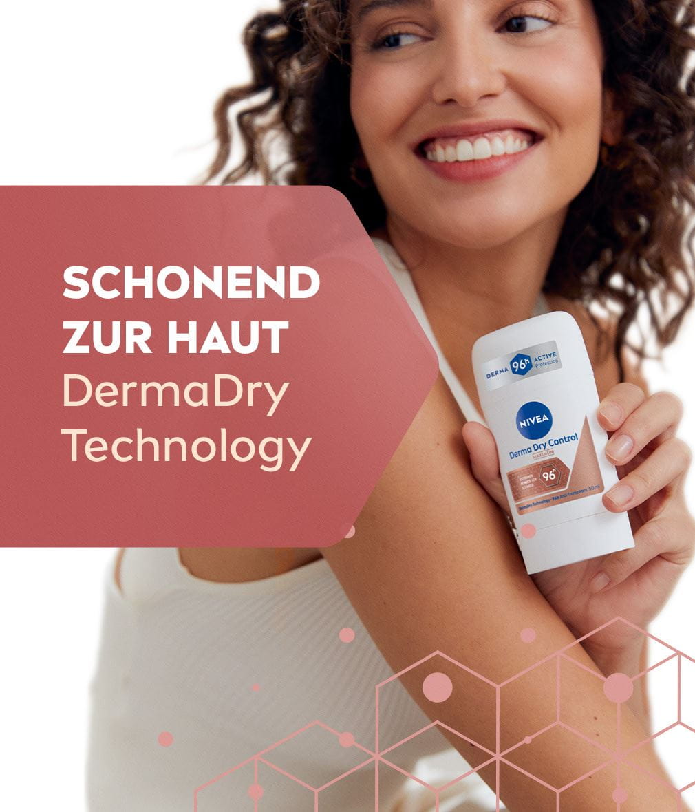 NIVEA Derma Dry Control Anti-Transpirant mit DermaDry-Stick-Technologie bietet klinisch nachgewiesenen Schutz gegen Schweiß und Geruch. Zuverlässiger 96h Anti-Transpirant-Schutz.