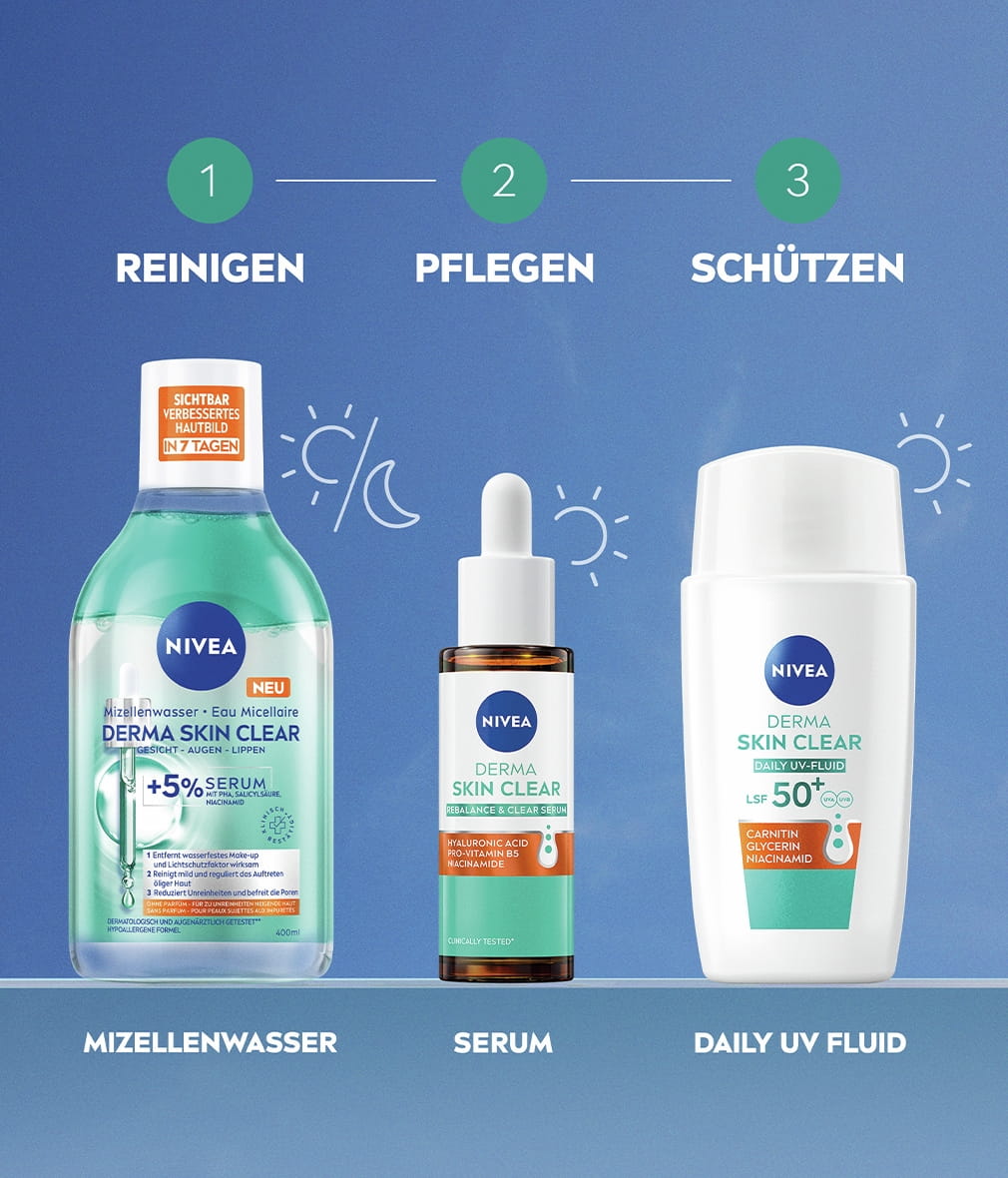 Die Formel mit Carnitin, Glycerin & Niacinamid wurde speziell für zu Unreinheiten neigende Haut entwickelt und ist ideal für die Anwendung unter Make-up geeignet. Das NIVEA Derma Skin Clear Daily UV-Fluid bietet einen 8h mattierenden Effekt und beugt verstopften Poren & Hautunreinheiten vor.
