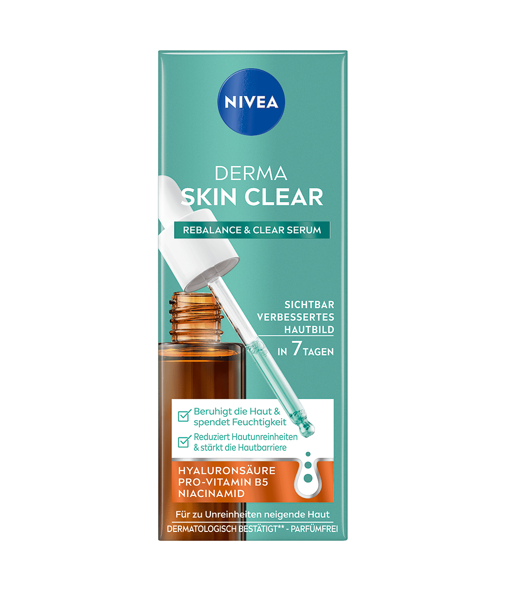 Das NIVEA DERMA SKIN CLEAR Rebalance & Clear Serum wurde speziell für zu Unreinheiten neigende Haut entwickelt. Mit Hyaluronsäure, Pro-Vitamin B5 und Niacinamid beruhigt es die Haut, spendet Feuchtigkeit und reduziert Hautunreinheiten. Für eine gestärkte Hautbarriere und ein sichtbar verbessertes Hautbild in 7 Tagen.