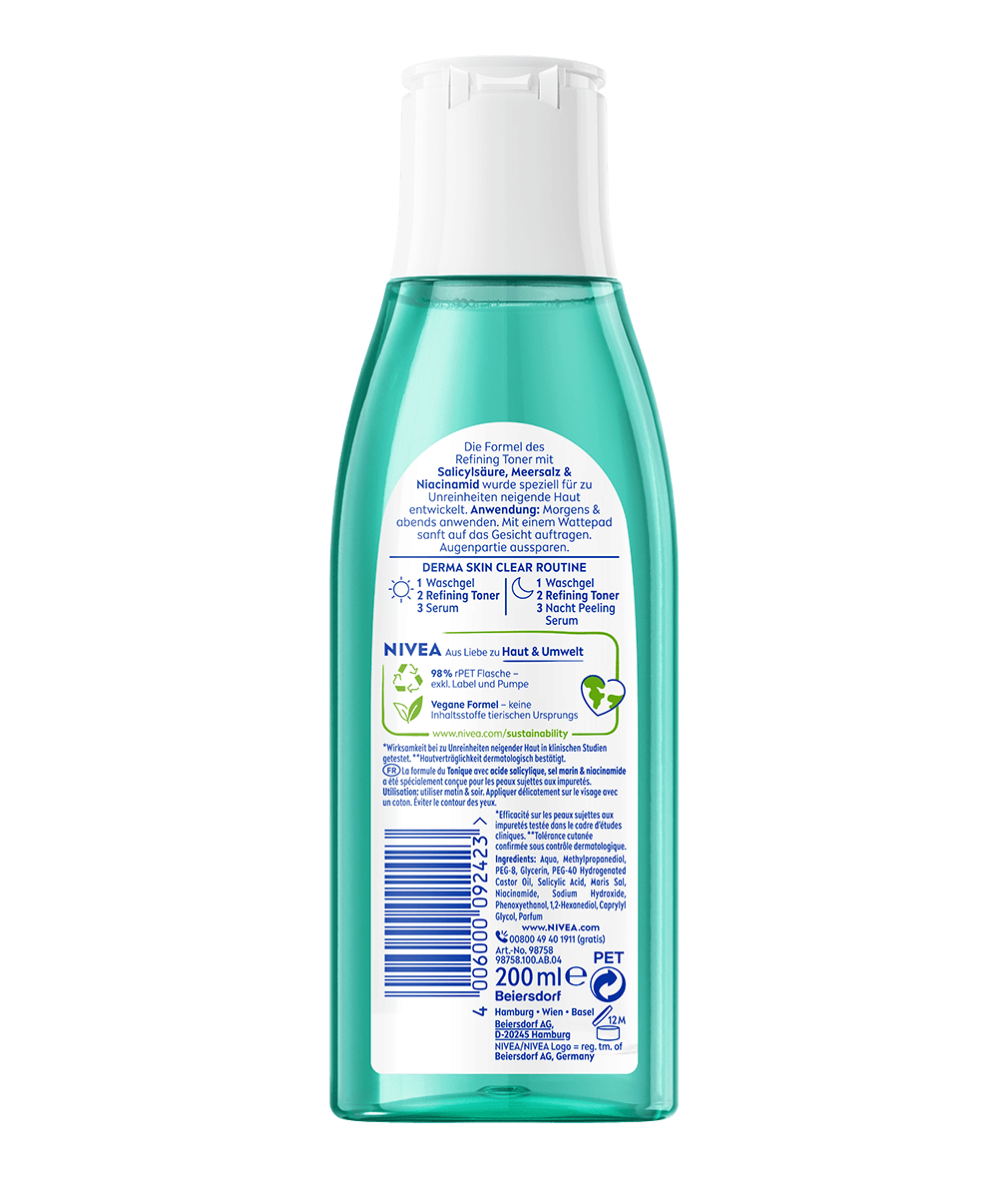 Das NIVEA DERMA SKIN CLEAR Waschgel wurde speziell für zu Unreinheiten neigende Haut entwickelt. Mit Salicylsäure, Meersalz und Niacinamid reinigt es gründlich, reduziert und verfeinert die Poren sichtbar und entfernt Mitesser. Wirksamkeit bei zu Unreinheiten neigender Haut klinisch getestet.