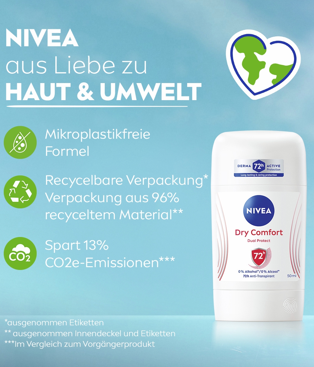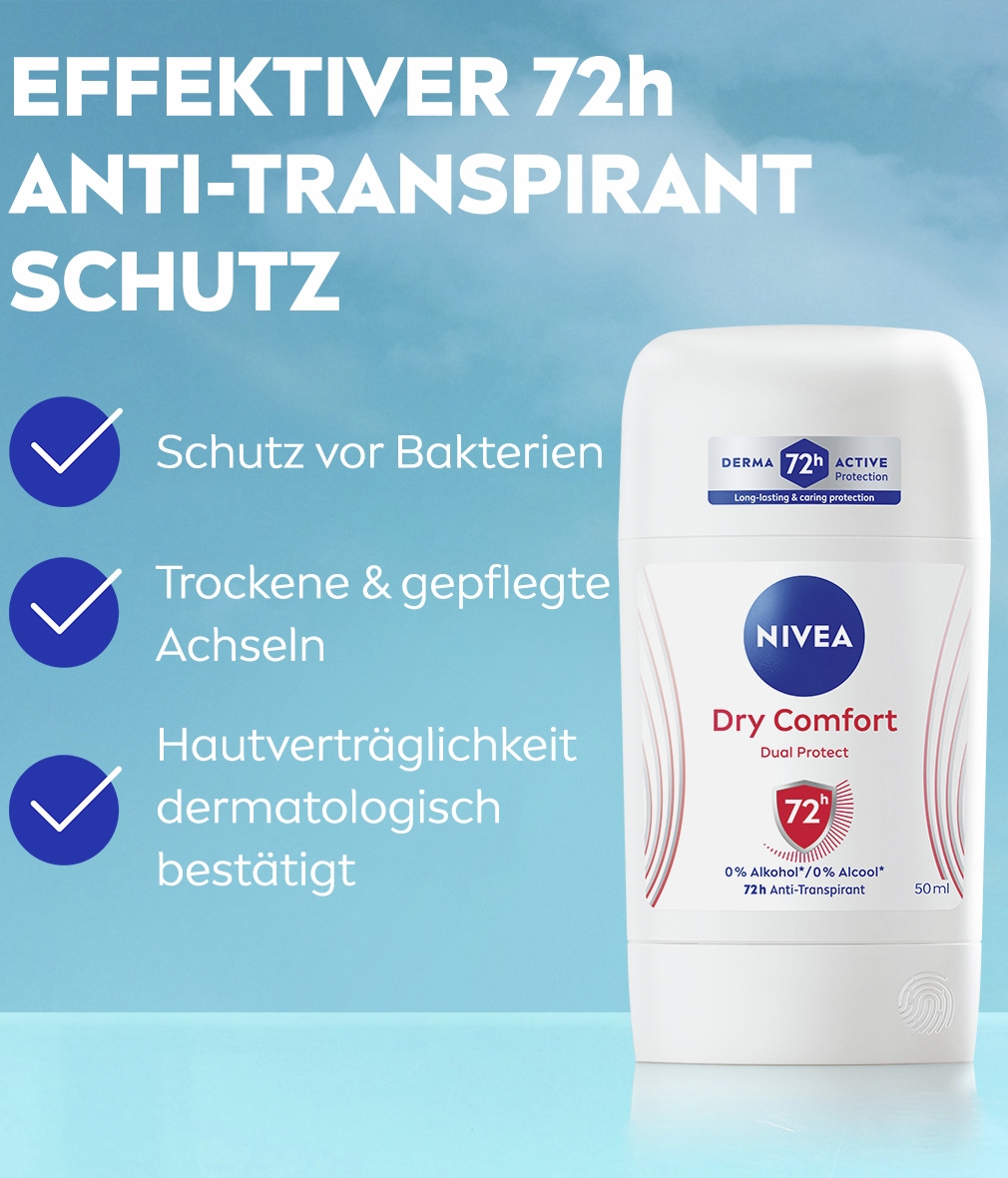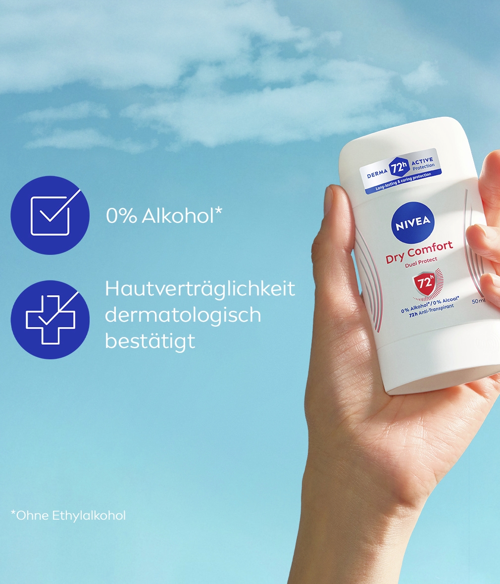 Der NIVEA Dry Comfort Anti-Transpirant Stick bietet zuverlässigen Schutz, der Ihre Haut pflegt, dank seiner Dual-Protect-Technologie und 0 % Alkohol. Unsere Anti-Transpirantien bieten Derma 72h Active-Schutz: Unsere Produkte wirken mit der Haut zusammen und bieten zuverlässige und starke Wirksamkeit gegen Schweiß und Geruch.