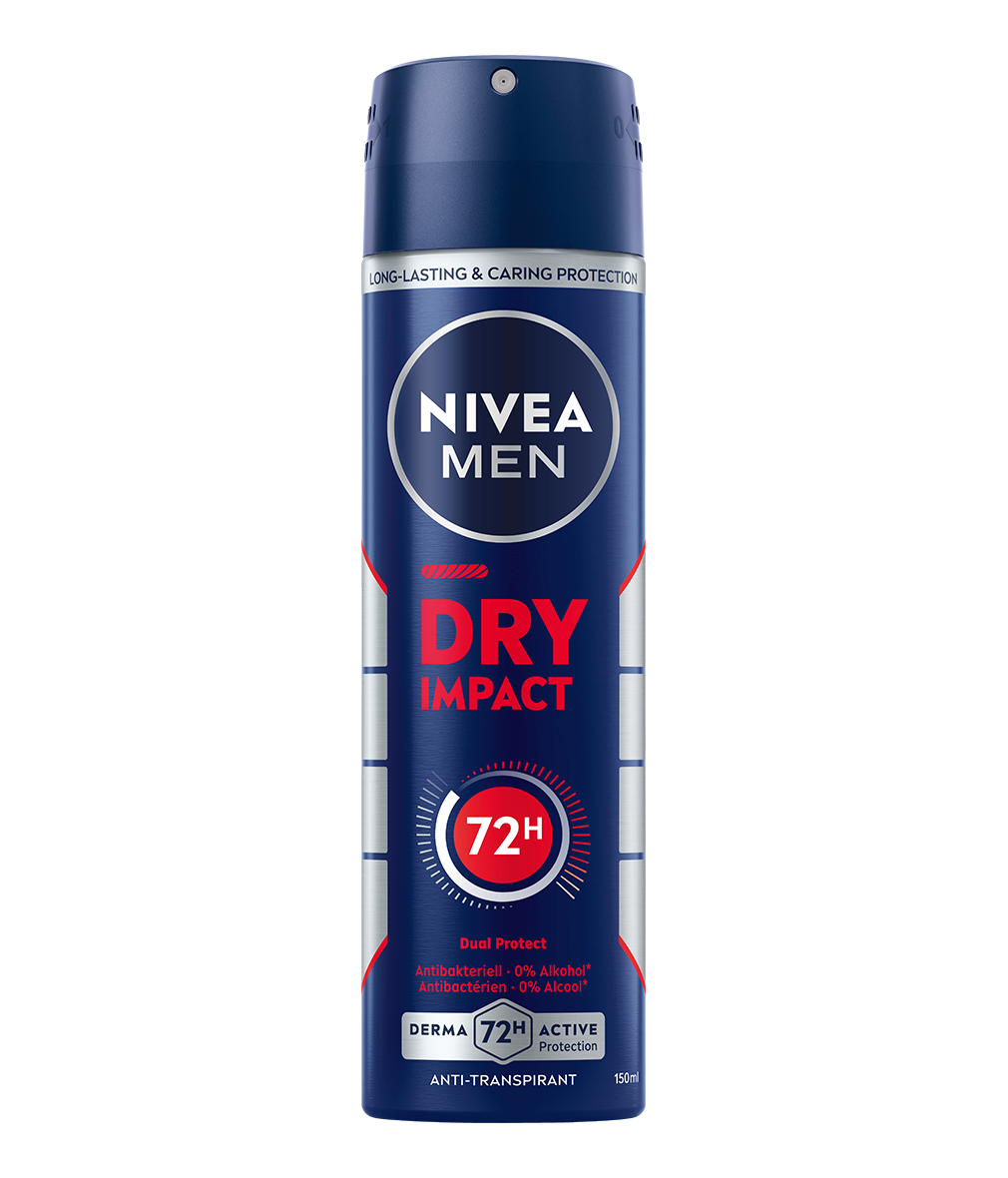 NIVEA MEN Dry Impact Anti-Transpirant bietet einen zuverlässigen, hautpflegenden 72h Schutz mit 0% Ethylalkohol. Die Formeln sind dermatologisch auf Hautverträglichkeit getestet.