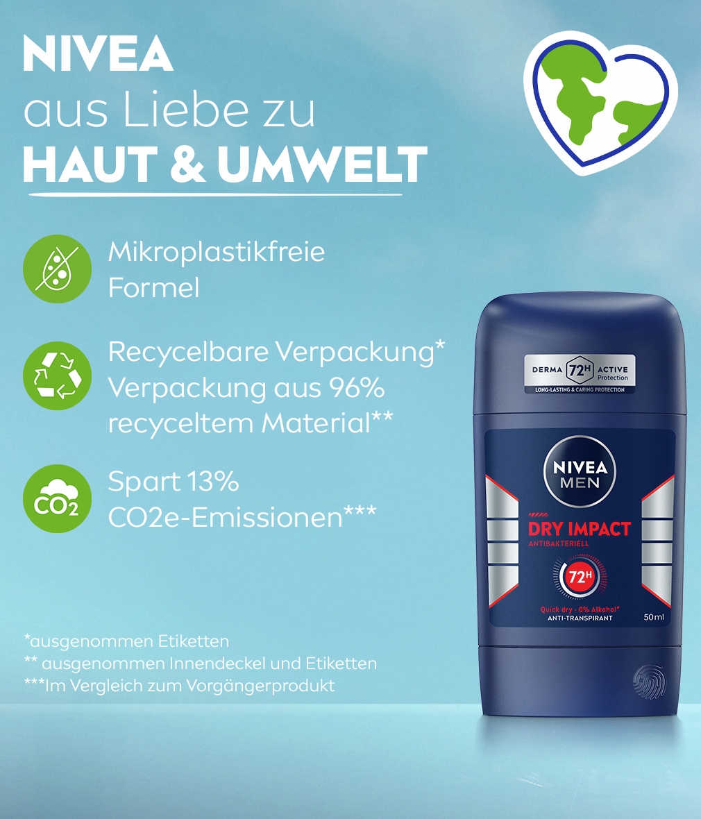 NIVEA MEN Dry Impact Anti-Transpirant Stick bietet zuverlässigen Schutz und pflegt gleichzeitig Ihre Haut. Die doppelt wirksame Formel mit 2 Anti-Transpirant-Wirkstoffen sorgt für schnelles Trocknen und enthält 0 % Alkohol für eine sanfte Pflege. 72 Stunden zuverlässiger Anti-Transpirant-Schutz, der Ihre Haut pflegt.