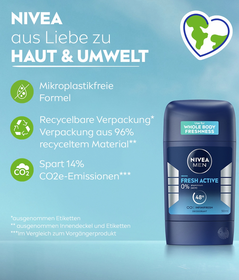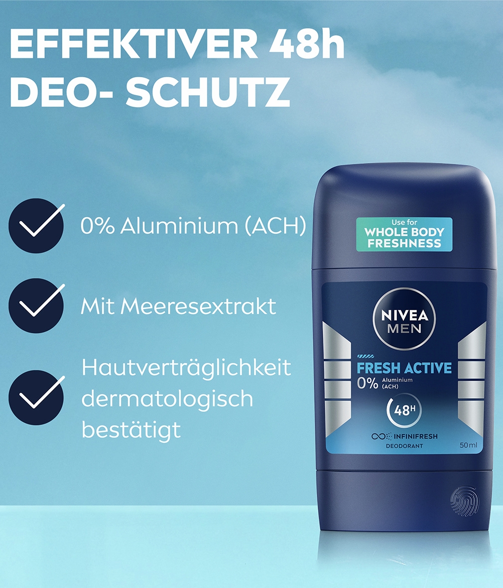 Der NIVEA MEN Fresh Active Stick sorgt den ganzen Tag lang für ein frisches Gefühl. Er garantiert lang anhaltende Reinheit und ein frisches Hautgefühl. Unsere Deodorants sind dermatologisch auf Hautverträglichkeit geprüft und bieten Derma 48h Active Schutz: Sie wirken mit der Haut zusammen und bieten zuverlässigen und wirksamen Schutz vor Schweiß und Geruch.