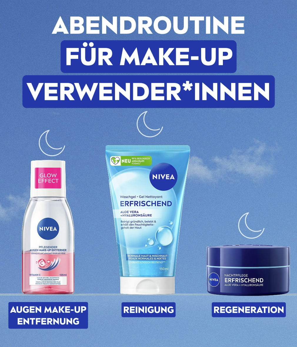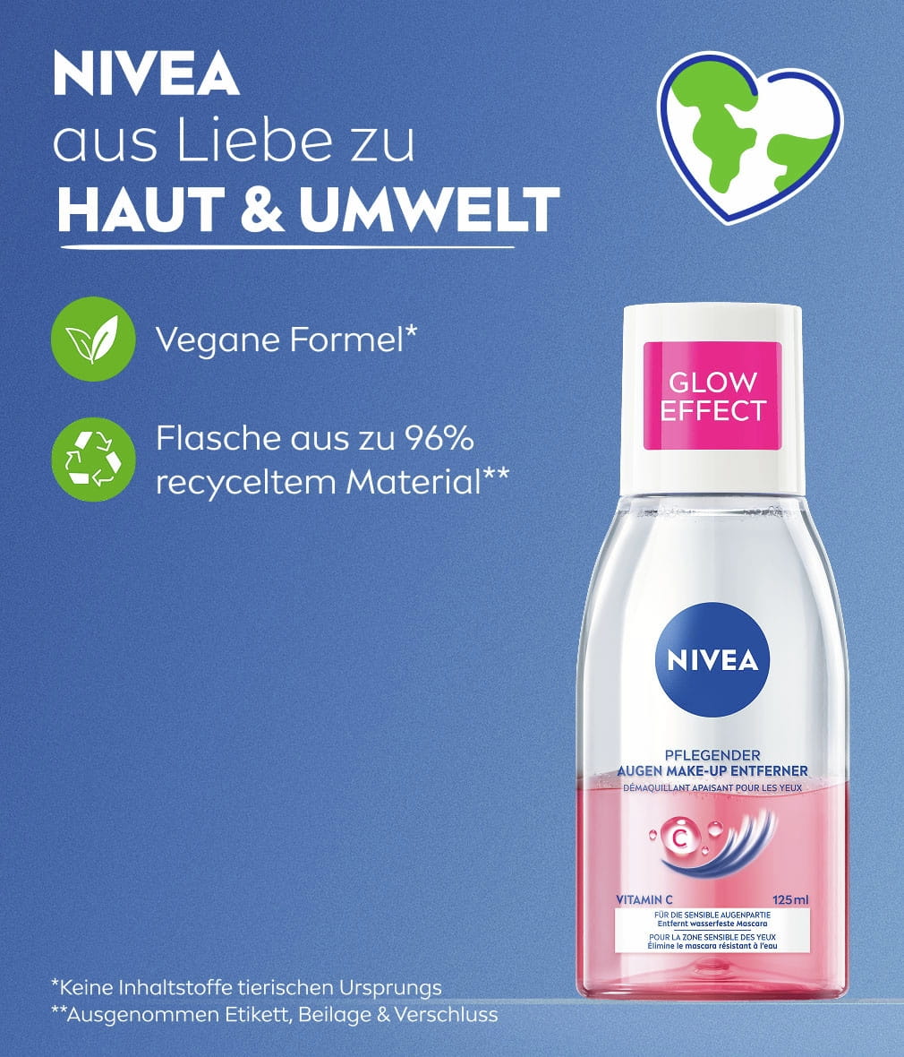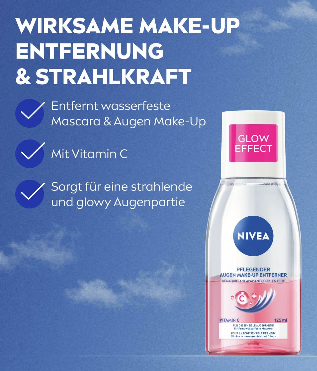 Der NIVEA Glow Effect Augen Make-up Entferner entfernt selbst extrem wasserfestes Augen-Make-up effektiv und pflegt gleichzeitig die empfindliche Augenpartie. Die Formel mit Vitamin C sorgt für ein strahlendes und belebtes Aussehen.
