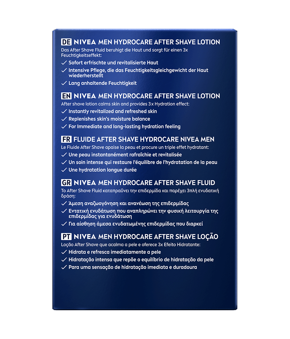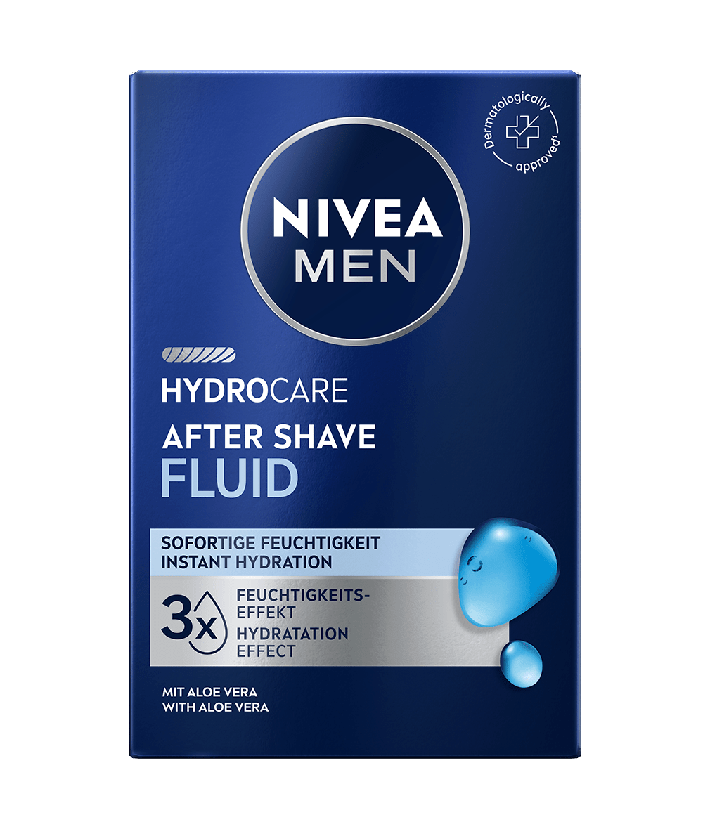 NIVEA MEN Hydrocare After Shave Fluid spendet mit Aloe Vera sofort Feuchtigkeit, beruhigt die Haut nach der Rasur und zieht schnell ein – für ein frisches, nicht fettendes Hautgefühl.