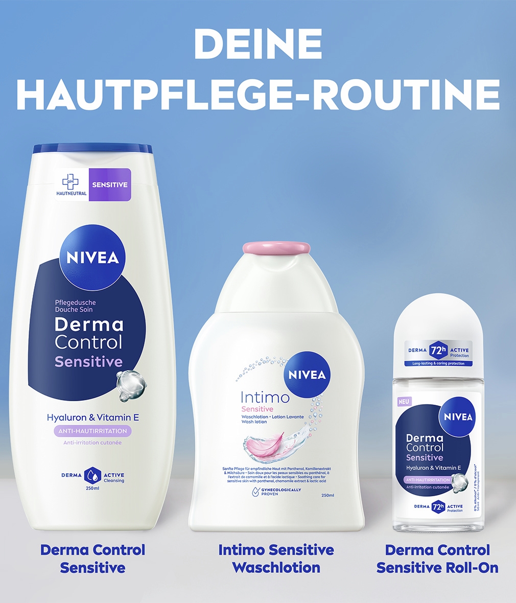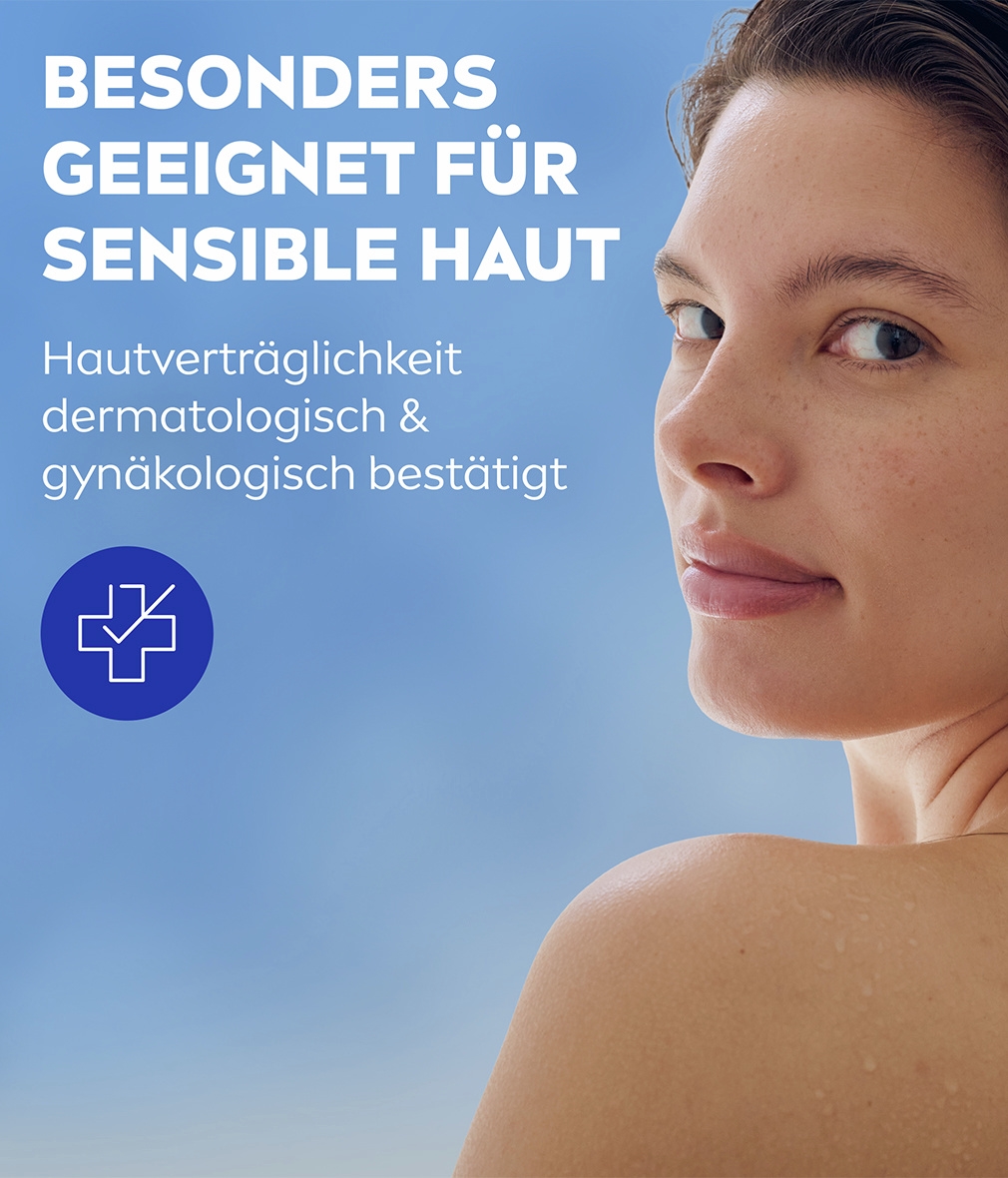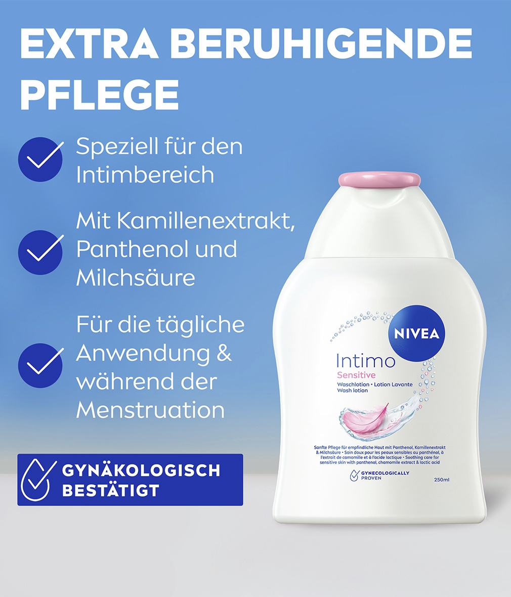 NIVEA Intimo Sensitive Waschlotion wurde entwickelt, um die empfindliche Haut im Intimbereich sanft zu reinigen. Die Formel mit Kamillenextrakt und Panthenol bietet besonders beruhigende Pflege, die hilft, Irritationen, vaginales Unwohlsein und Trockenheit im Intimbereich vorzubeugen. Das Produkt ist besonders für empfindliche Haut geeignet und kann täglich verwendet werden – auch während der Menstruation. Die pflegende Formel mit Milchsäure hilft, den natürlichen pH-Wert des Intimbereichs zu erhalten und sorgt für sofortigen Komfort, der den ganzen Tag anhält. Die Waschlotion kann täglich wie ein normales Duschgel verwendet werden – ausschließlich zur äußeren Anwendung. Die Hautverträglichkeit dieser Waschlotion ist dermatologisch und gynäkologisch bestätigt.