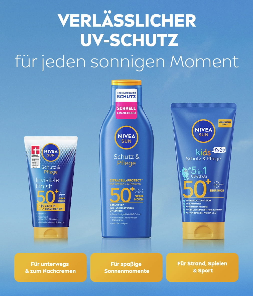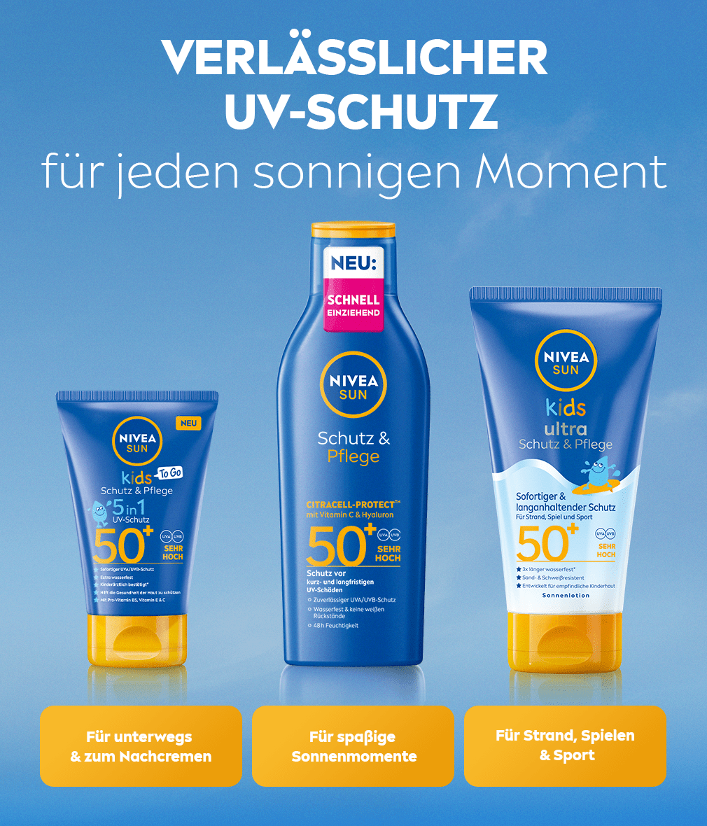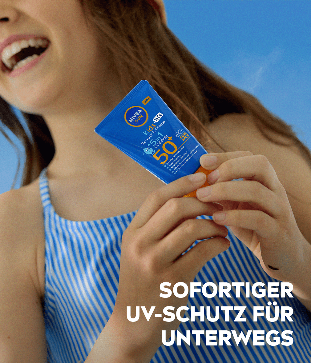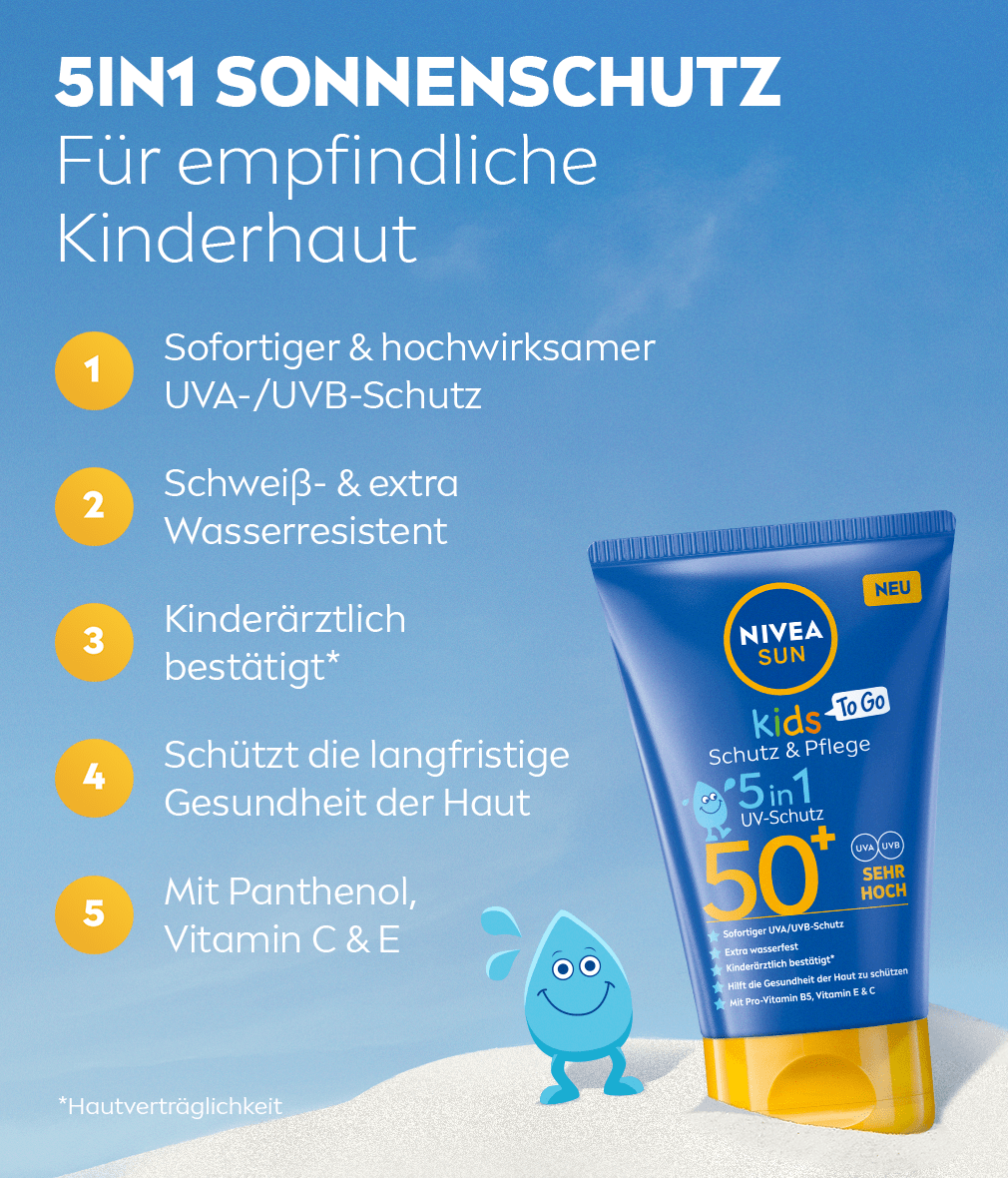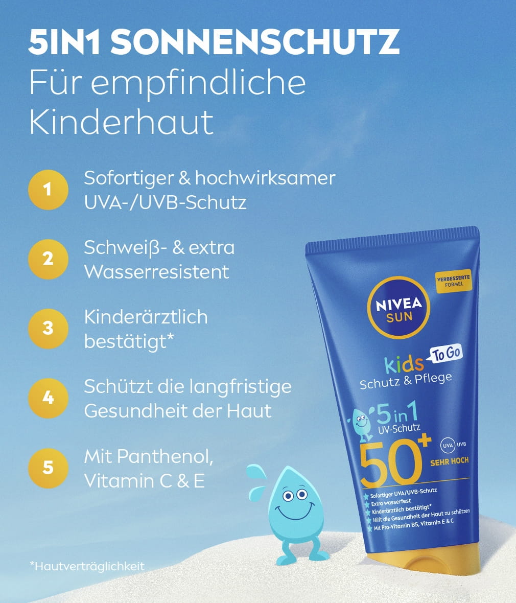 Zuverlässiger 5in1 UV-Schutz, der auf die Bedürfnisse der empfindlichen Kinderhaut abgestimmt ist. Sofortiger UVA/UVB-Schutz mit schweiß- und extra wasserfester Formel. NIVEA SUN Kids Protect & Care To Go SPF50+