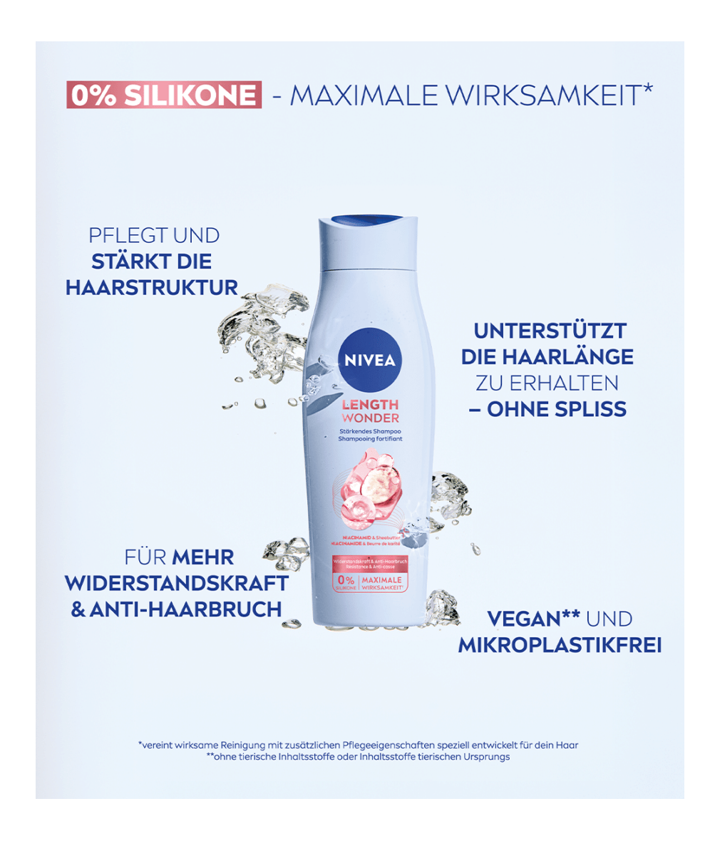 Das NIVEA Length Wonder stärkende Shampoo mit Nianicamid und Sheabutter pflegt und stärkt die Haarstruktur und unterstützt die Haarlänge zu erhalten - ohne Spliss.