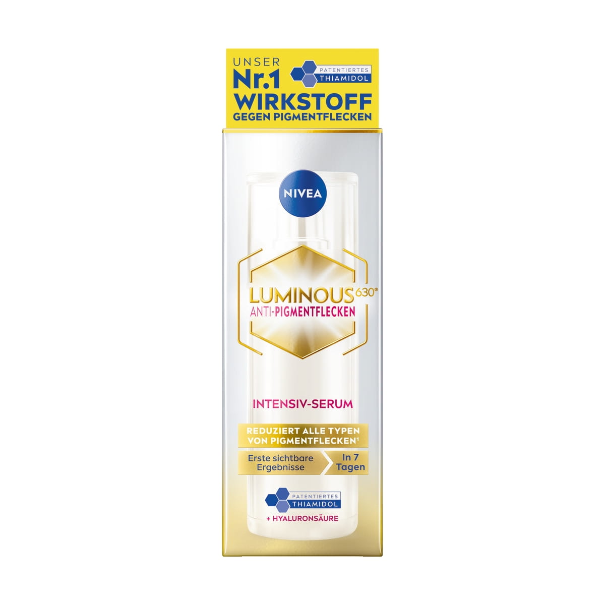 Verbessere deine Pflegeroutine gegen Pigmentflecken im Gesicht: mit unserem patentierten Wirkstoff THIAMIDOL. THIAMIDOL reduziert sichtbare Pigmentflecken und sogar solche, die noch nicht zu erkennen sind.