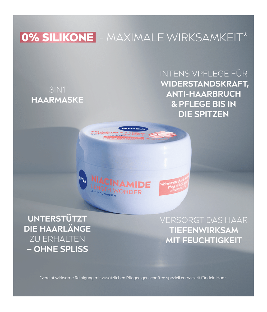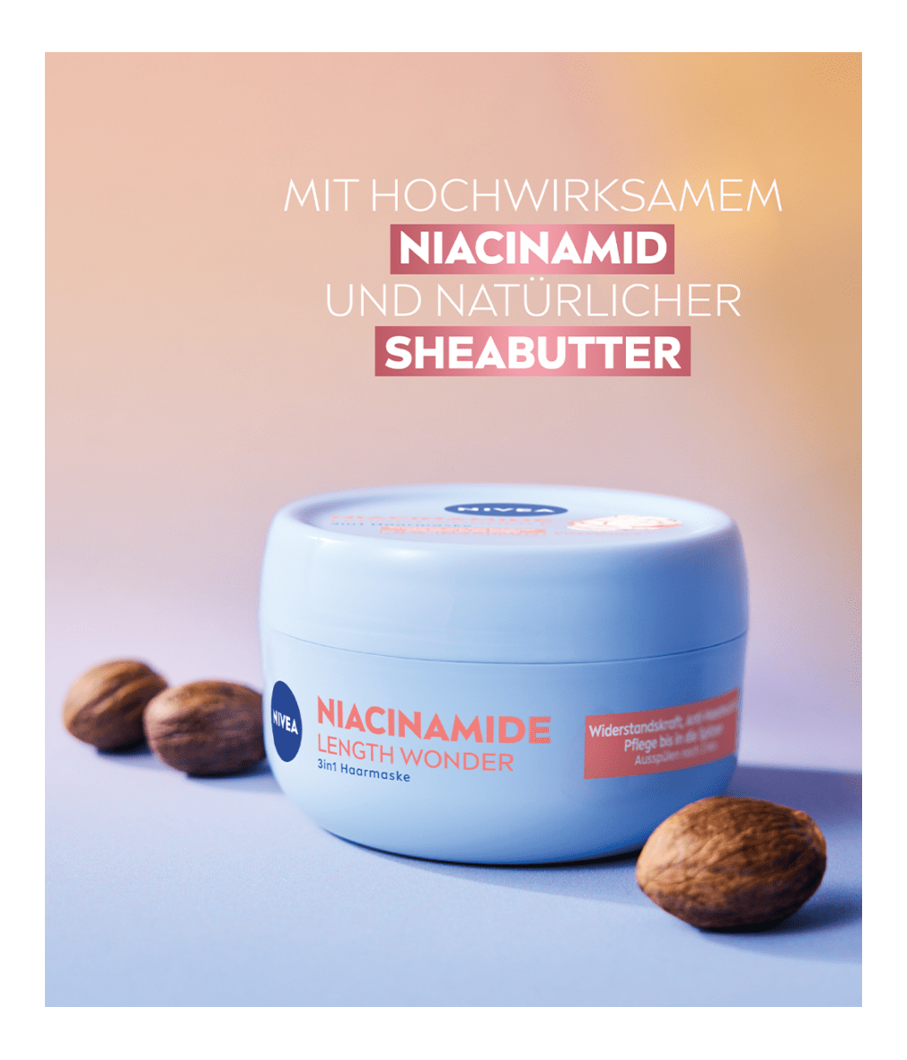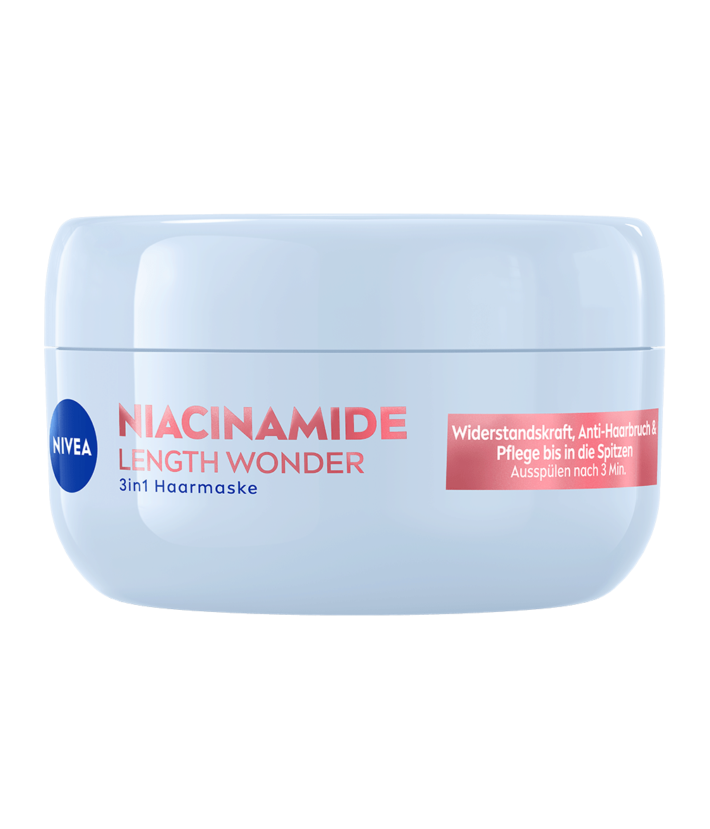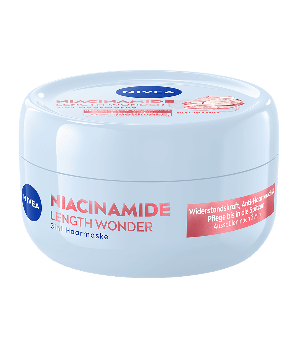 Die NIVEA Niacinamide Length Wonder 3in1 Haarmaske mit der pflegenden Kombination aus Niacinamid und Sheabutter unterstützt die Haarlänge zu erhalten, pflegt und verleiht mehr Widerstandskraft.