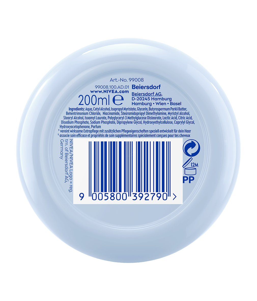 Ingredients: Aqua, Cetyl Alcohol, Isopropyl Myristate, Glycerin, Butyrospermum Parkii Butter, Behentrimonium Chloride, Niacinamid, Stearamidopropyl Dimethylamine, Myristyl Alcohol, Stearyl Alcohol, Isoamyl Laurate, Polyglyceryl-3 Methylglucose Distearate, Lactic Acid, Citric Acid, Disodium Phosphate, Sodium Phosphate, Dipropylene Glycol, Hydroxyethylcellulose, Caprylyl Glycol, Hydroxyacetophenone, Parfum