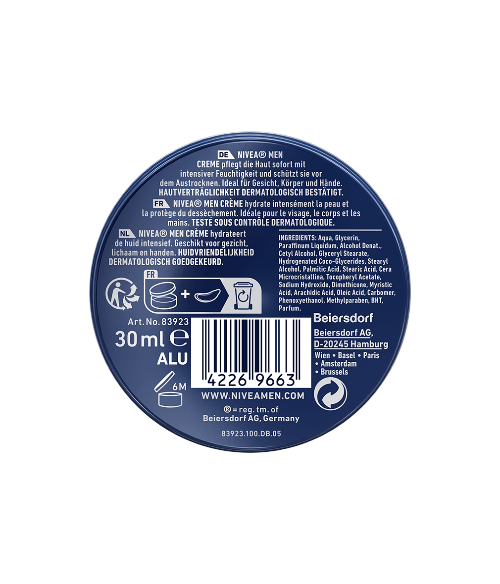 Schenken Sie Ihrer Haut unkomplizierte aber intensive Pflege mit der NIVEA MEN CREME. Die Creme mit frischem und maskulinem Duft kann für Gesicht, Körper und Hände verwendet werden. Die Feuchtigkeitscreme wurde speziell für die Bedürfnisse der Haut von Männern entwickelt. Die leichte, nicht fettende Formel mit Vitamin E zieht schnell ein und spendet langanhaltende Feuchtigkeit für ein erfrischtes Hautgefühl. Die typisch NIVEA-blaue Metalldose mit doppelter Prägung sieht prägnant aus und liegt dabei gut in der Hand. Dank ihrer praktischen Größe kann die Gesichtscreme sogar unterwegs zum Einsatz kommen. Die Creme schützt die Haut zuverlässig vor dem Austrocknen und ist ideal für Gesicht, Körper und Hände. So einfach und effektiv kann Hautpflege sein mit der NIVEA MEN CREME. Die Hautverträglichkeit der Gesichtspflege ist dermatologisch bestätigt.