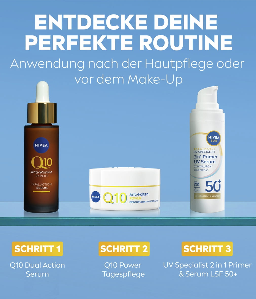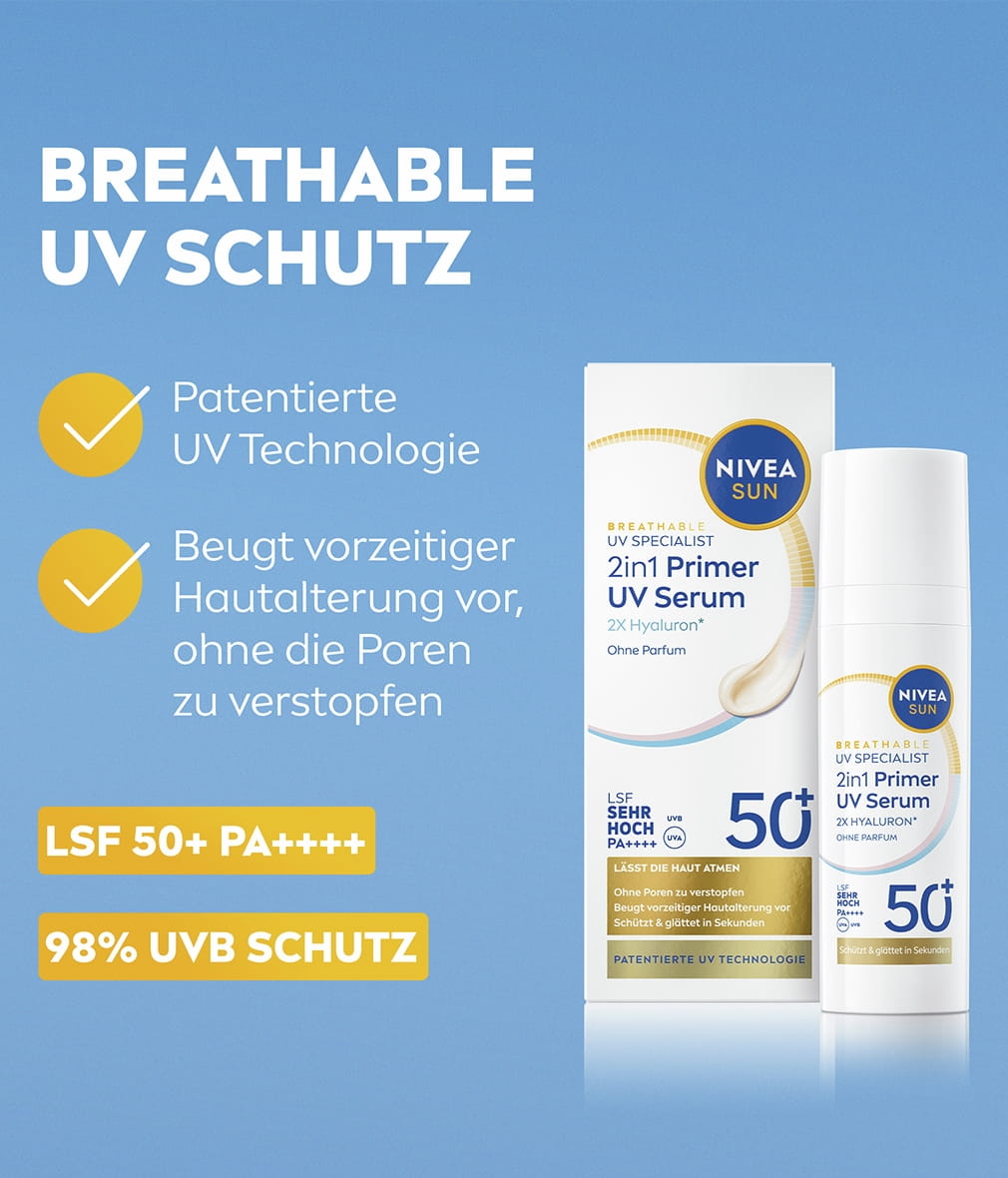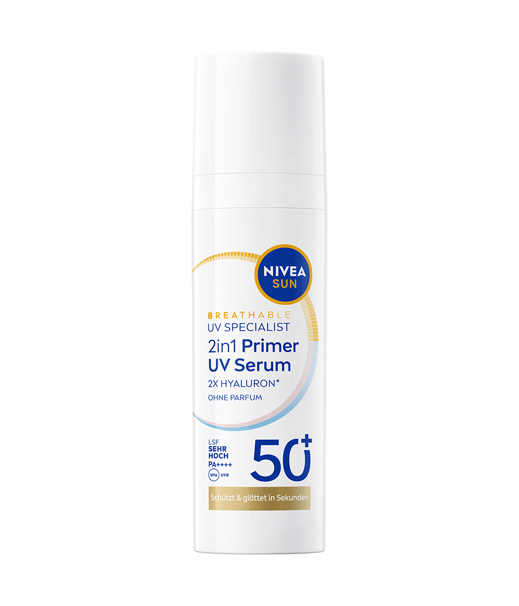 NIVEA SUN Breathable UV Specialist 2in1 Primer UV Serum LSF 50+ beugt vorzeitiger Hautalterung vor, ohne die Poren zu verstopfen. Schützt und glättet die Haut und verlängert das Make-up-Finish.