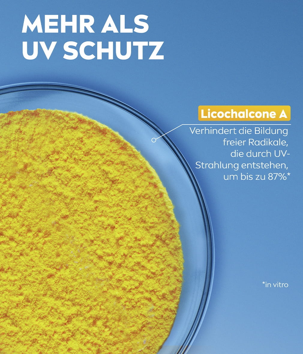 - GESICHTSSONNENSCHUTZ ÜBER DEN LSF HINAUS – Verhindert die Bildung von freien Radikalen, die durch UV-Strahlung verursacht werden, um bis zu 87 % (in vitro).