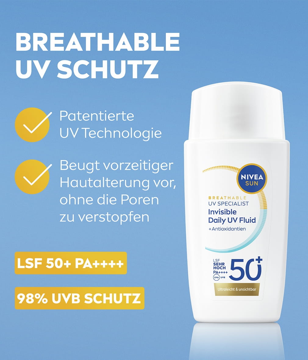 NIVEA SUN Breathable UV Specialist Invisible Daily Fluid LSF 50+ beugt vorzeitger Hautalterung vor, ohne die Poren zu verstopfen. Unsichtbar auf allen Hauttönen. Zieht sofort ein, ohne weiße Rückstände zu hinterlassen.