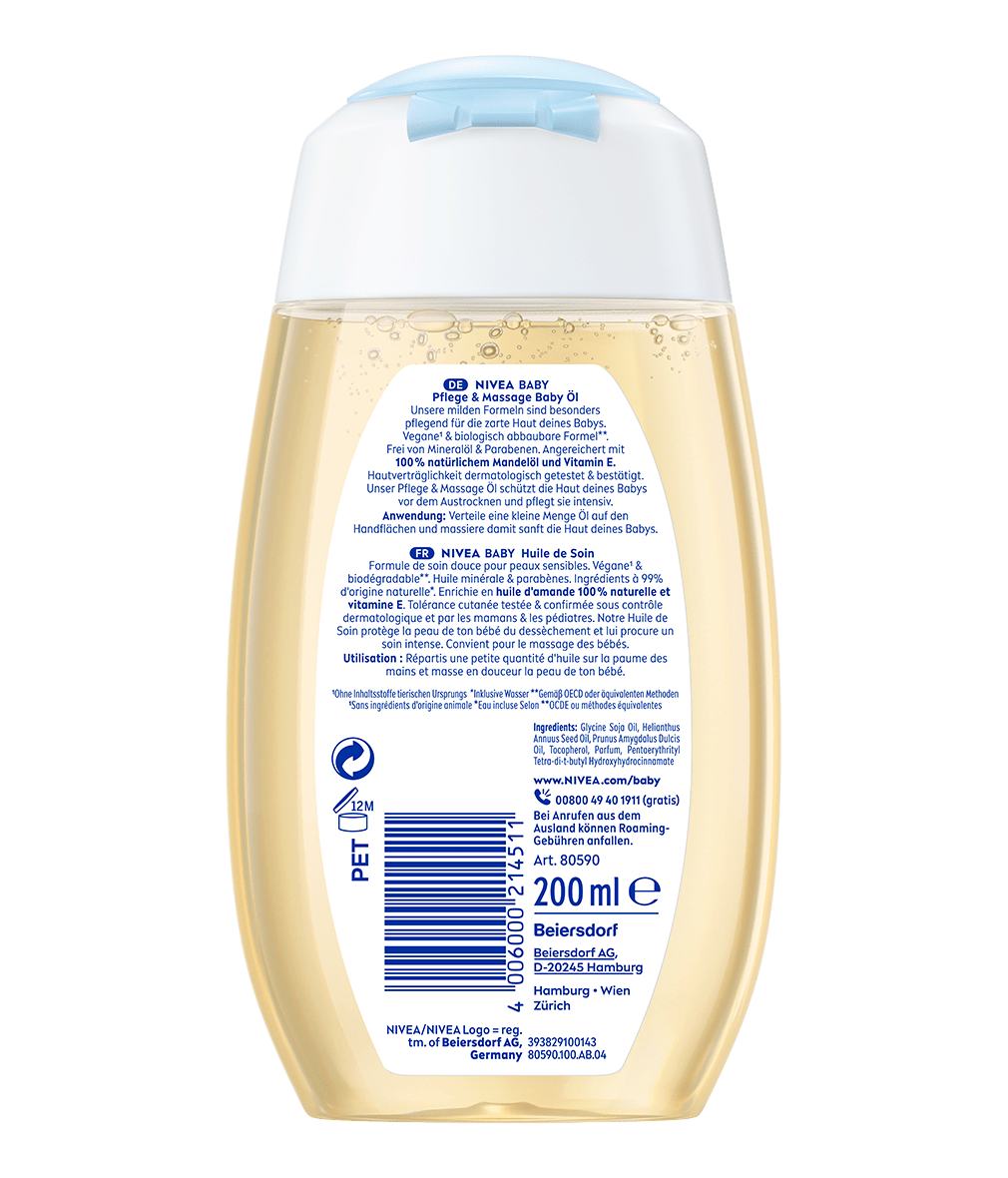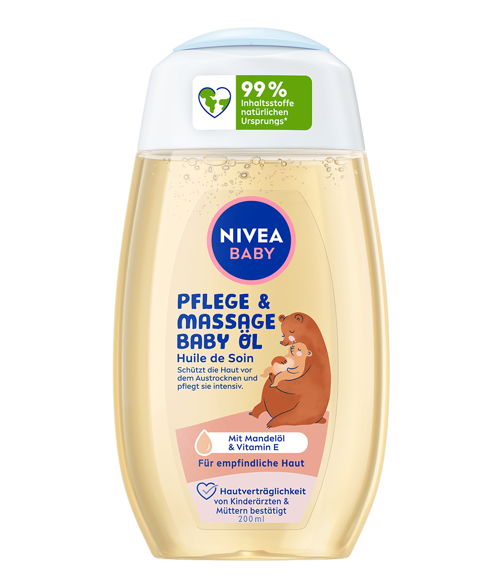 Das NIVEA Baby Pflege & Massage Baby Öl pflegt die Haut deines Babys besonders intensiv und eignet sich perfekt für die sanfte Babymassage. Die milde Formel besteht zu 99% aus Inhaltsstoffen natürlichen Ursprungs* und ist geeignet für empfindliche Babyhaut. Das Baby Öl schützt die Haut vor dem Austrocknen, stärkt die zarte Haut deines Babys und unterstützt ihre natürliche Entwicklung mit jeder Berührung. Die vegane Formel ist frei von Mikroplastik***, Mineralöl und Parabenen. Zudem ist sie für eine intensive Pflege angereichert mit 100% natürlichem Mandelöl und wertvollem Vitamin E. Die Hautverträglichkeit ist von Kinderärzten & Müttern bestätigt. Entdecke auch unsere weiteren Pflege-, Feuchttücher- und Reinigungsprodukte. NIVEA Baby - Hautpflege mit jeder Berührung. *Inklusive Wasser **Gemäß OECD oder äquivalenten Methoden ***Gemäß UNEP Definition