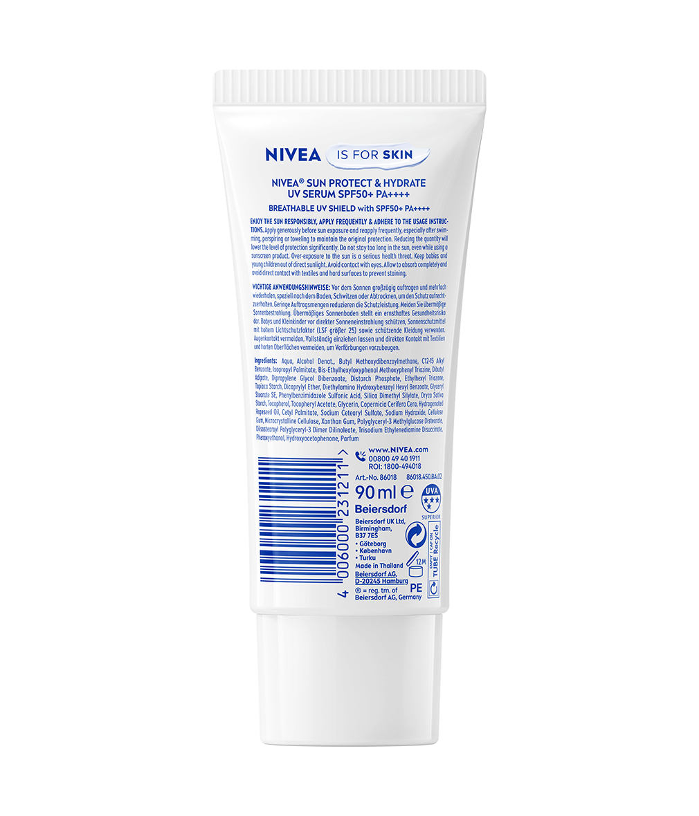 NIVEA SUN Protect & Light Feel Serum SPF 50+ bietet hohen Schutz, ohne die Poren zu verstopfen. Für Gesicht und Körper. Pflegt und spendet Feuchtigkeit. Lässt die Haut atmen und klebt nicht.