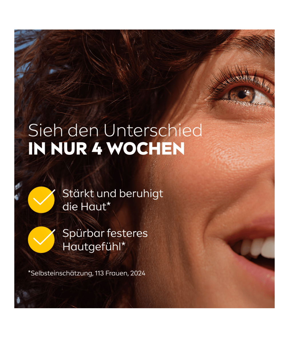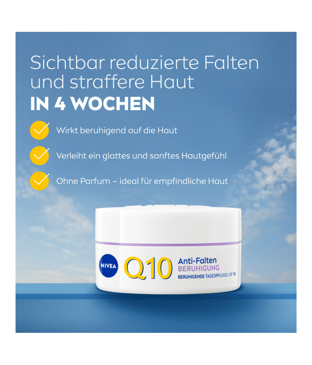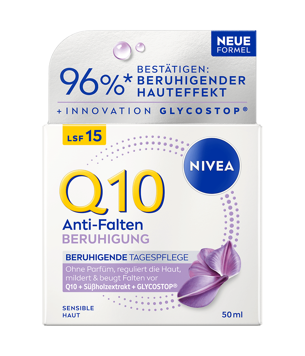 NIVEA Q10 Anti-Falten beruhigende Tagespflege mit GLYCOSTOP® besteht aus einer parfümfreien Formel, die im Einklang mit dem Mikrobiom der Haut – der ersten Abwehrlinie der Haut – wirkt. Für beruhigte, entspannte und gesund aussehende Haut.