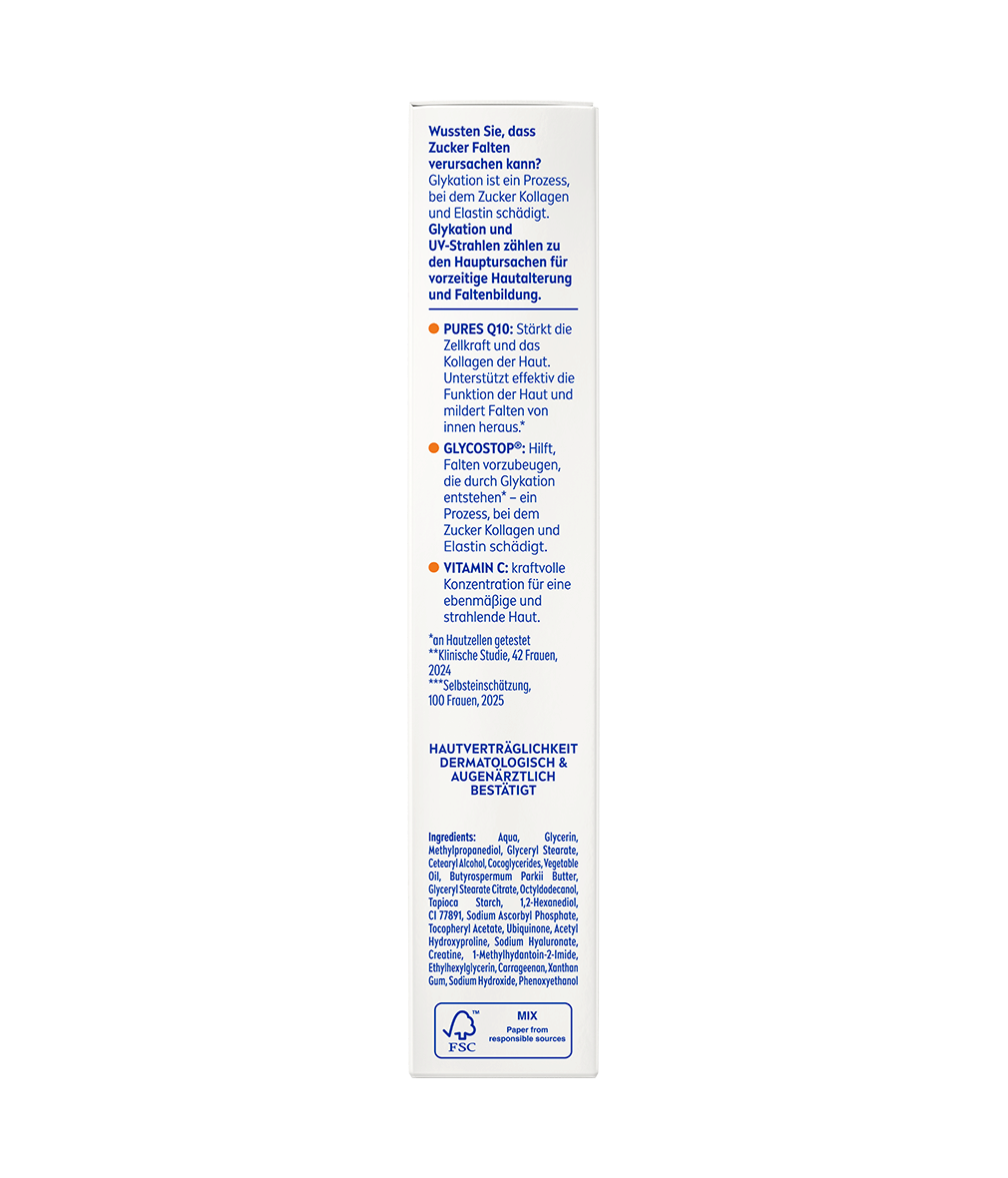 Diese Augencreme mit hautidentischem Q10, Vitamin C und GLYCOSTOP® mildert Anzeichen von Müdigkeit und fahler Haut. Die Creme strafft spürbar die Augenpartie und versorgt die Haut mit intensiver Feuchtigkeit.