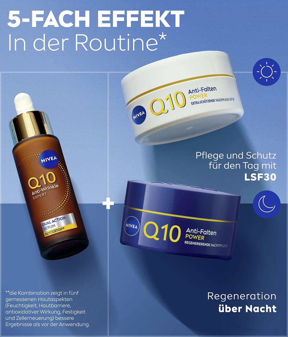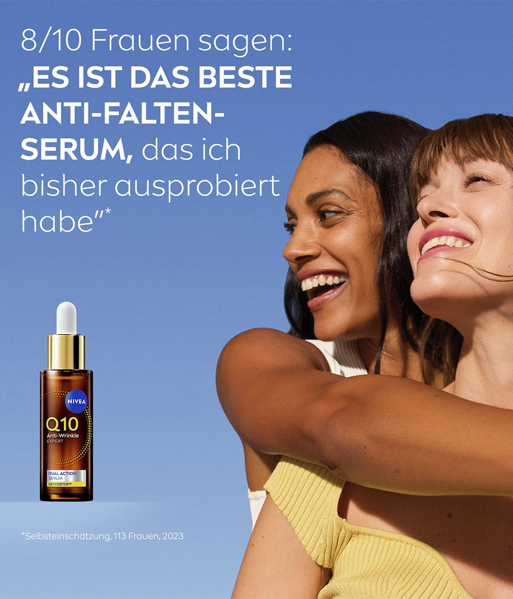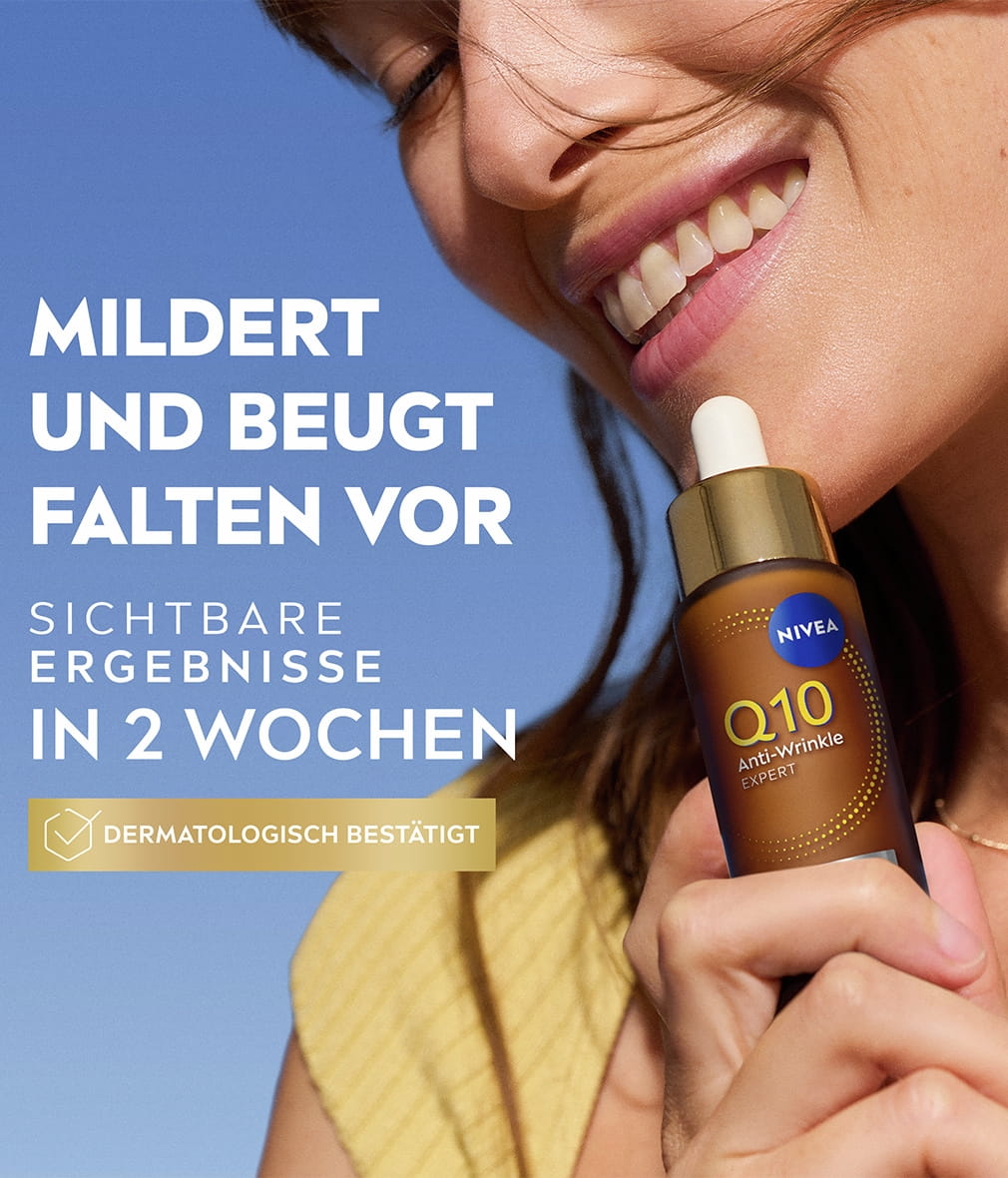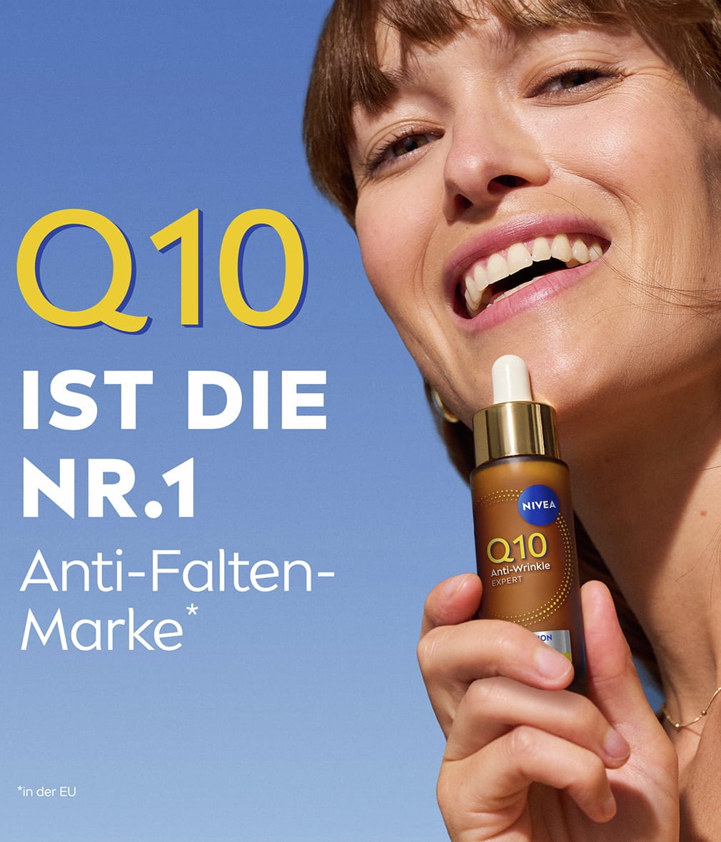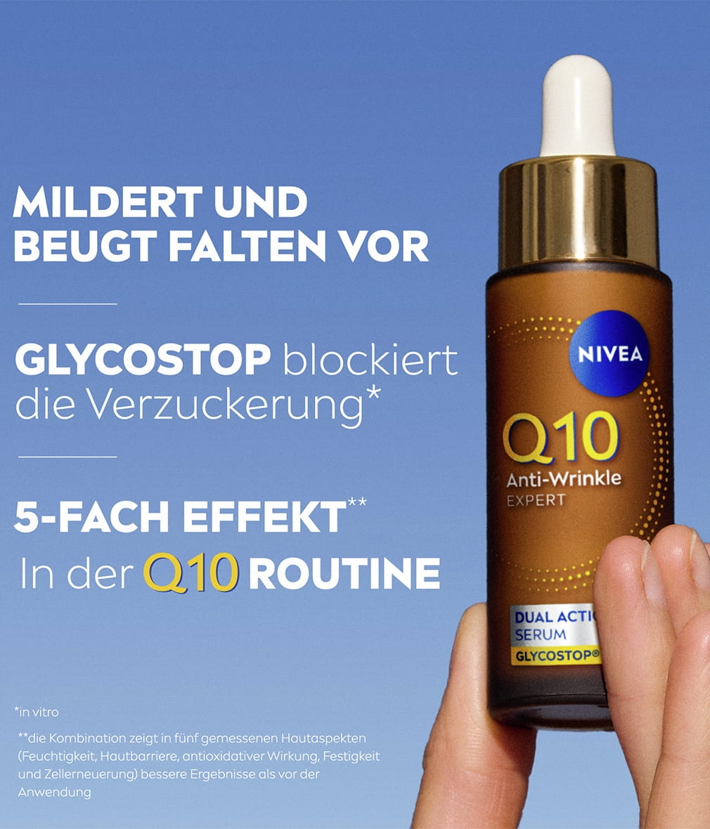 Das NIVEA Q10 Anti-Falten Dual Action Serum EXPERTE Serum mit Anti-Glykations-Technologie, angereichert mit purem Q10 und GLYCOSTOP®, reduziert selbst tiefste Falten und beugt neuen, durch Glykation verursachten Falten vor.