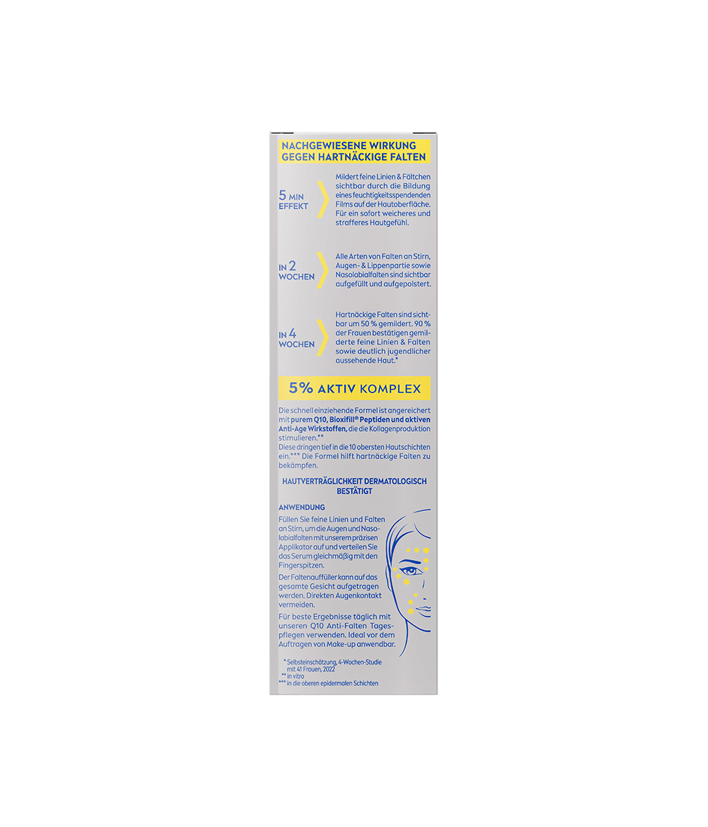 - Füllt Falten sofort sichtbar auf und mildert tiefere Falten bei regelmäßiger Anwendung
