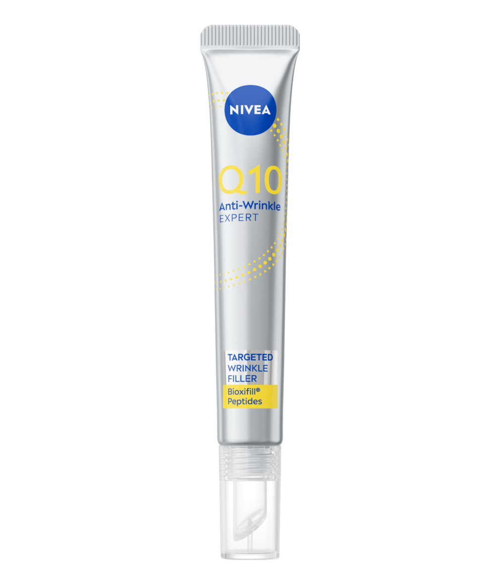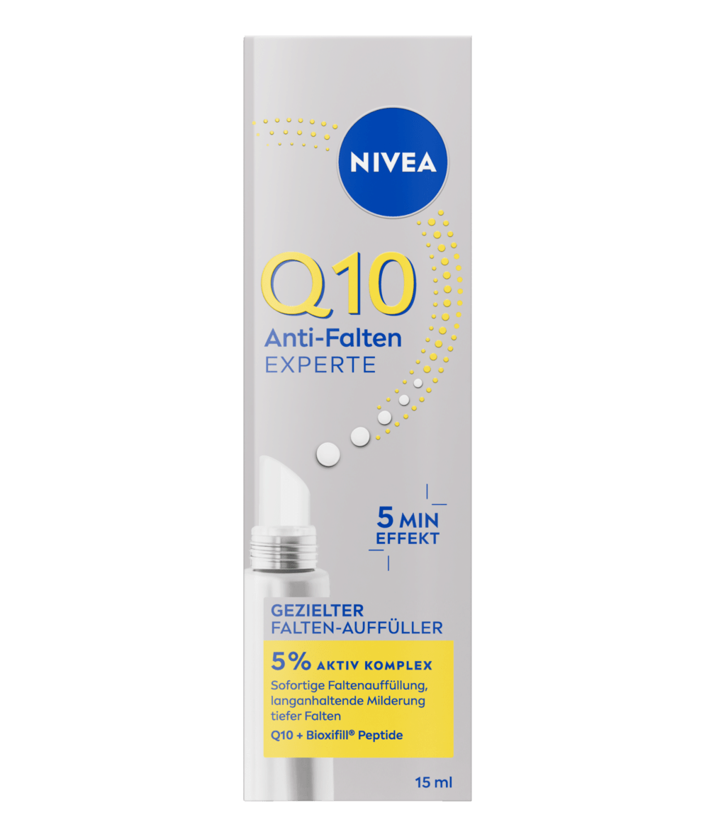 Der NIVEA Q10 Anti-Falten EXPERTE Gezielter Falten-Auffüller mildert feine Linien und Fältchen in 5 Minuten sowie tiefere Falten in 4 Wochen.