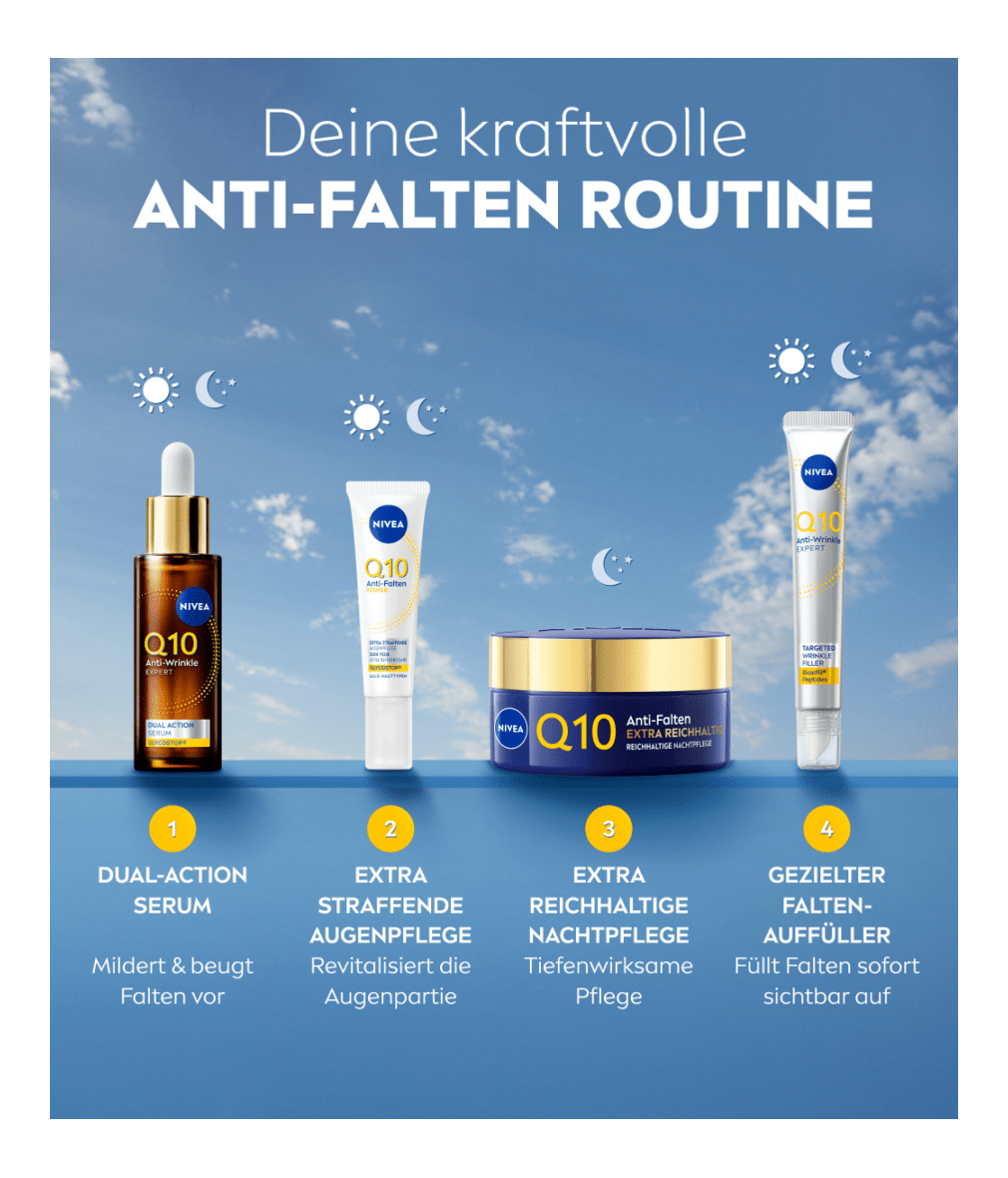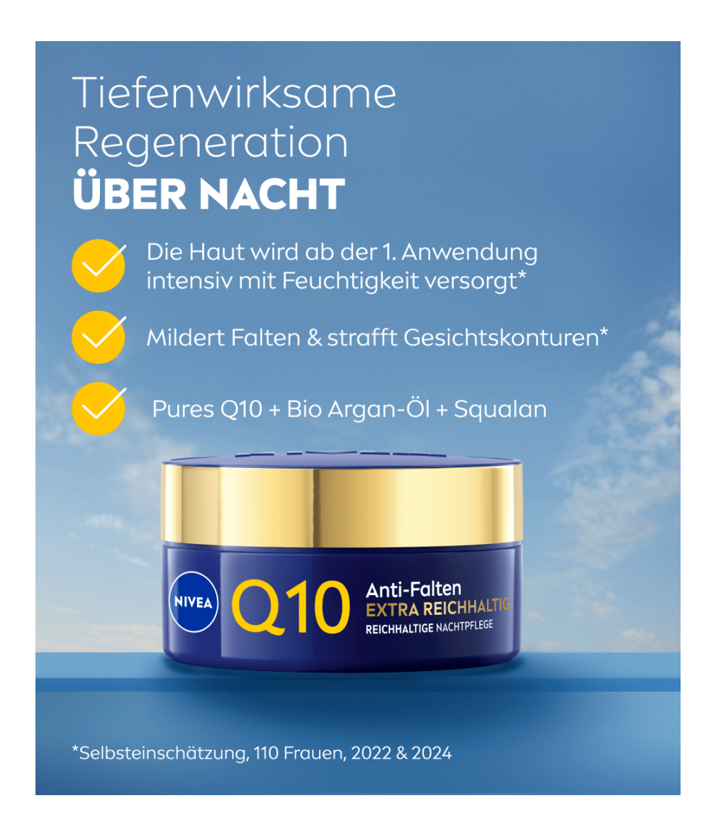 NIVEA Q10 Anti-Falten EXTRA-REICHHALTIG Nachtpflege wurde speziell für die Bedürfnisse trockener bis sehr trockener Haut entwickelt. Die Creme schützt die Haut vor dem Austrocknen und verbessert die Widerstandsfähigkeit der Haut | 50 ml