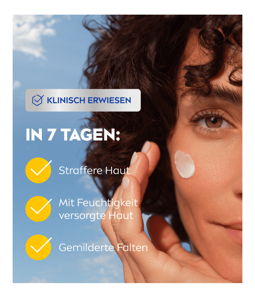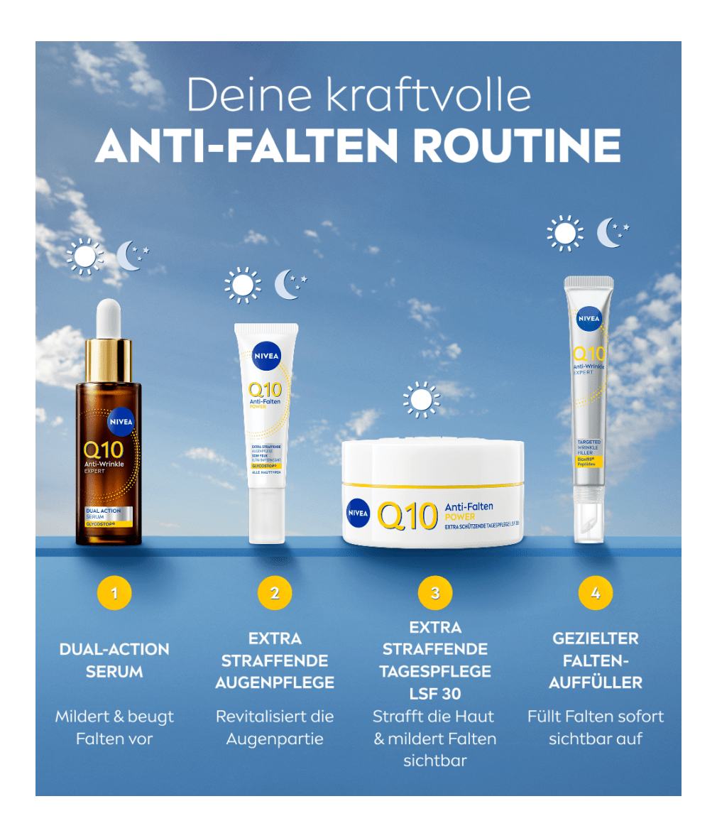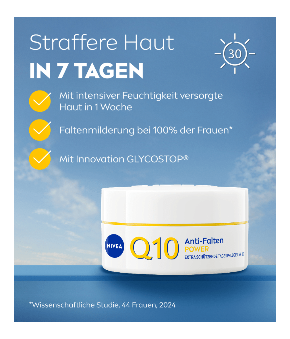 Die NIVEA Q10 Anti-Falten extra schützende Tagespflege mit zweifach Wirkung von GLYCOSTOP®, Q10, Kreatin und LSF 30 sorgt geschützte, geschmeidige Haut. Angereichert mit Hyaluronsäure spendet die Tagespflege intensive Feuchtigkeit und wirkt regenerierend. Die innovative Formel mit LSF 30 schützt vor vorzeitiger, lichtbedingter Hautalterung.